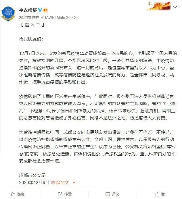 紧接着,成都市公安局也在微博发布倡议书。