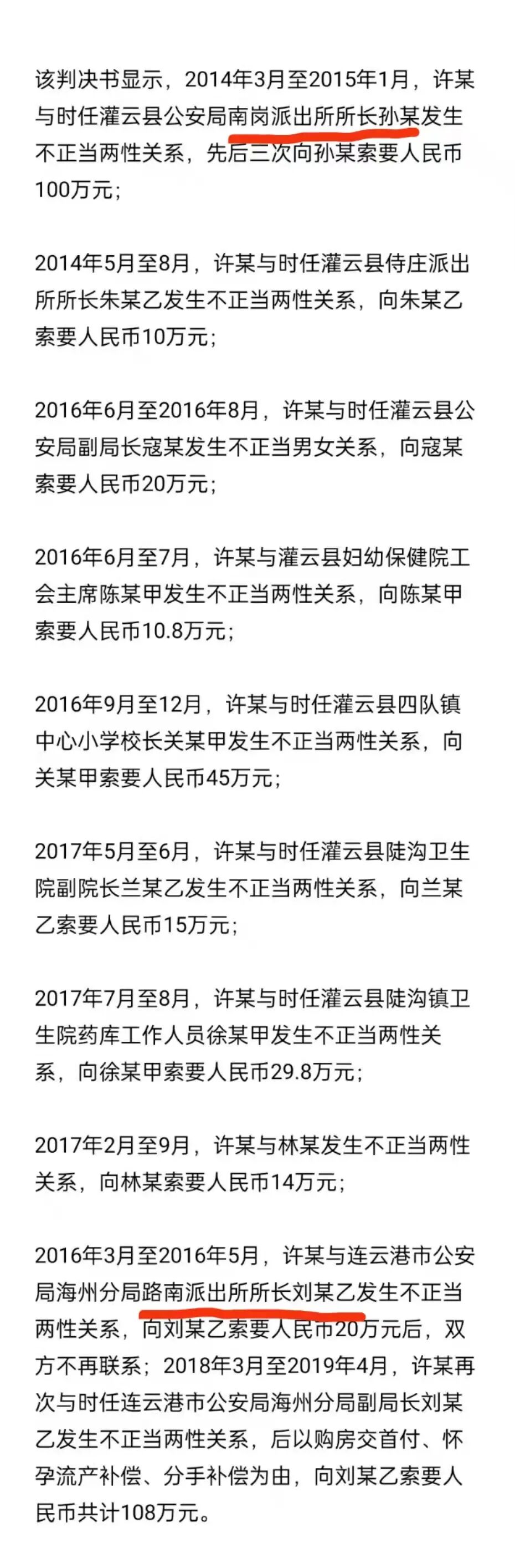 根据一审判断书,可以知道孙某某应该是时任灌云县公安局南岗派出所所长的那位,刘某某应该是时任连云港市公安局海州分局路南派出所所长的那位,请注意标红部分: