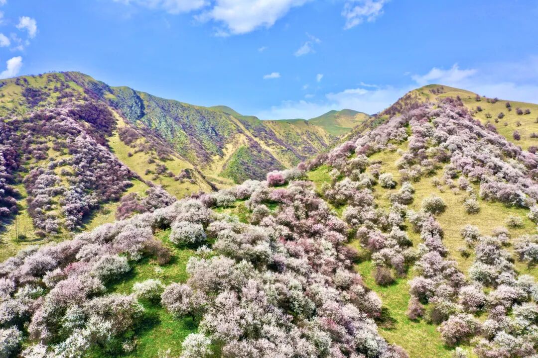 若不是亲眼所见,谁能想到,每年4月份,诗人笔下江南烟雨中娇弱柔美的杏花,在伊犁河谷中却呈现出如潮水般的磅礴气势。山坡、沟谷,满是粉白的杏花。再搭配着草原的新绿,点缀着牧民的小屋和悠闲的牛羊,春天就这样以豪迈的步伐,拉开花季的序幕。