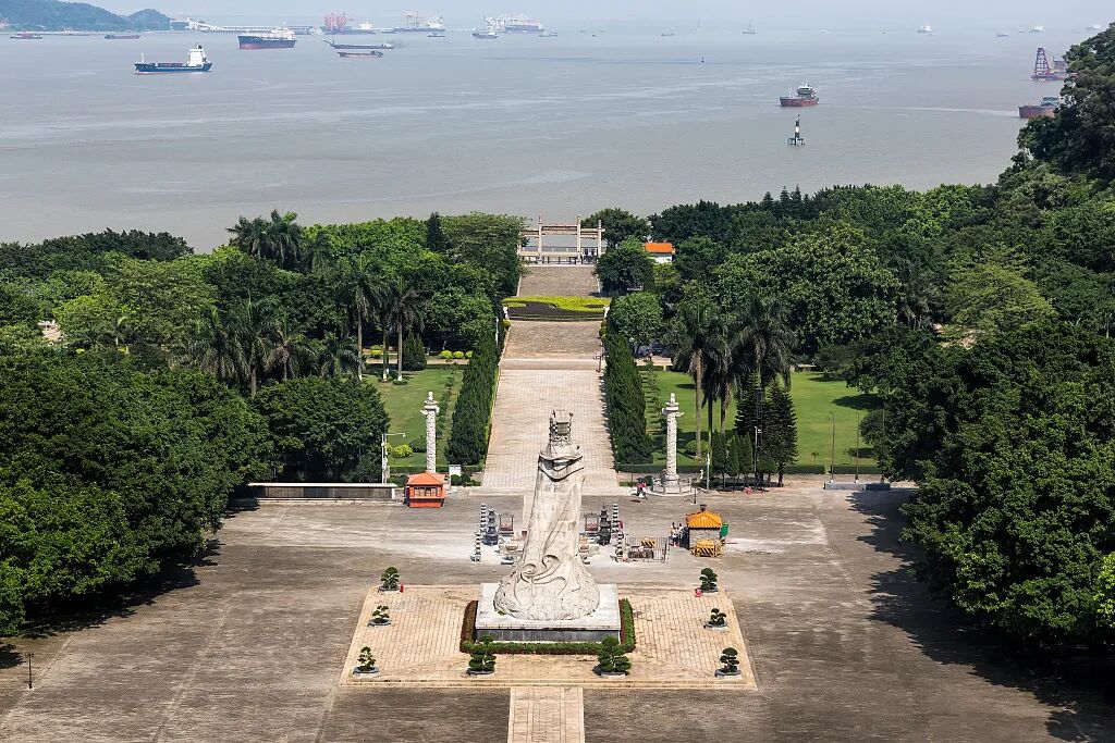 在广东省东莞市西南,珠江口东岸,有一个威远岛。岛西南武山上修有威远、镇远、靖远三炮台。鸦片战争时期,广东水师提督关天培指挥抗击英军侵略,殉国于此。图为从威远岛眺望狮子洋与虎门大桥。