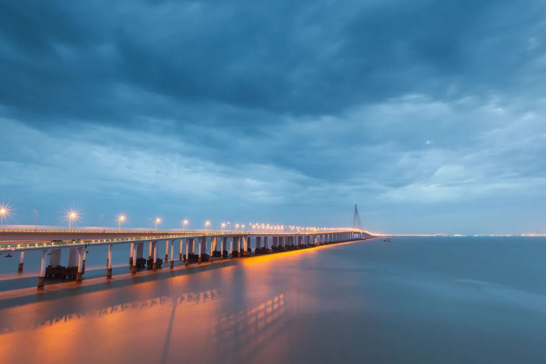要问在上海,谁对海洋有着最直观的体会,可能要数在洋山深水港拉货的司机师傅。图为连接上海南汇与洋山港的东海大桥,线路全长32.5千米,一路向南逶迤至舟山群岛。