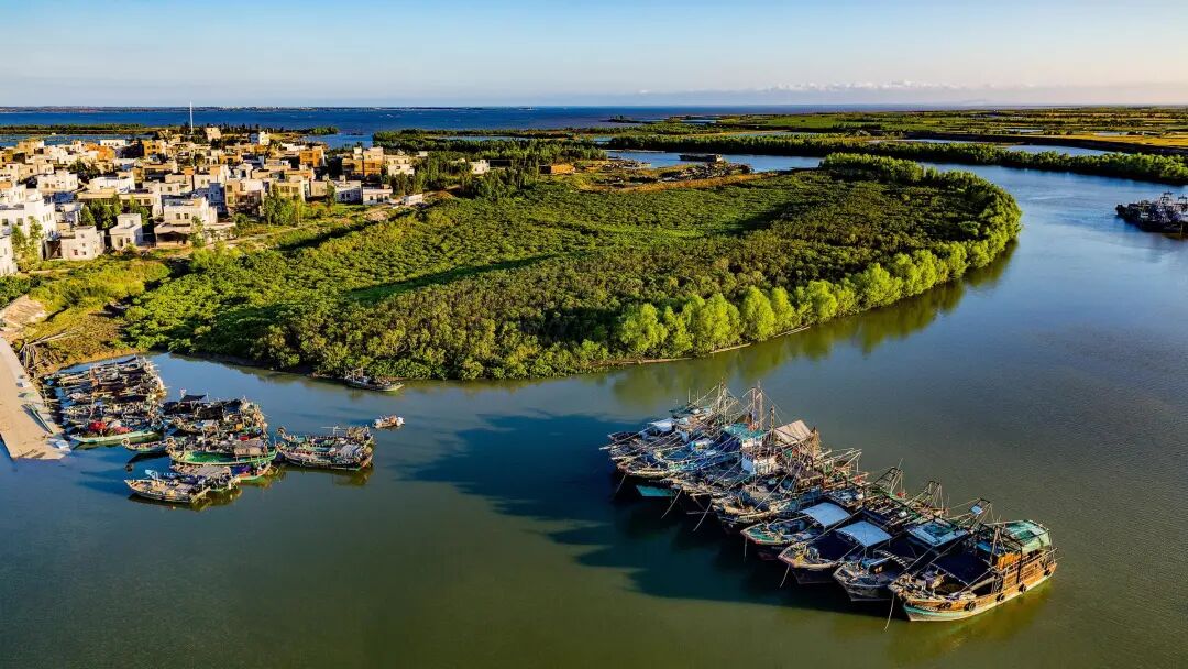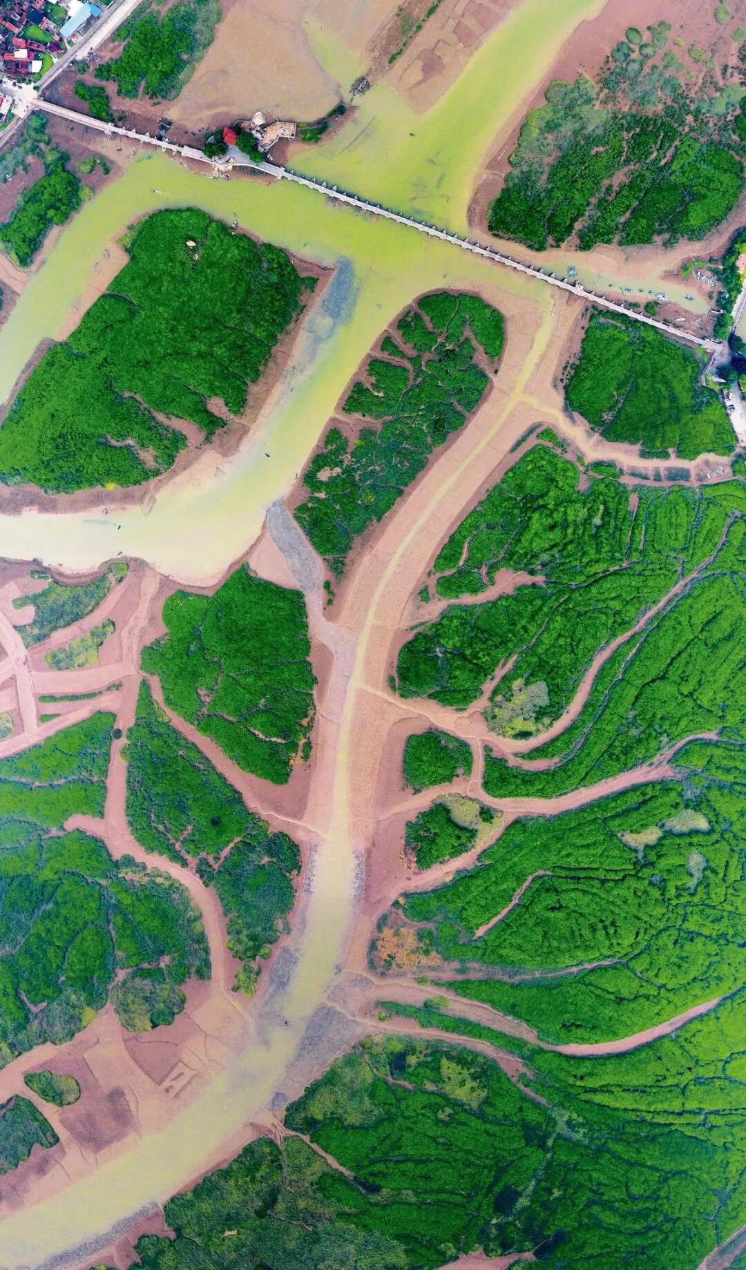 在湛江雷州湾通明港,蓊郁的红树林沿着海堤,绕着古渡,伸向大海。图片中宁静的绿岛上,一半密密覆盖着红树植物,一半点缀着错落的民居,显得自然和谐。