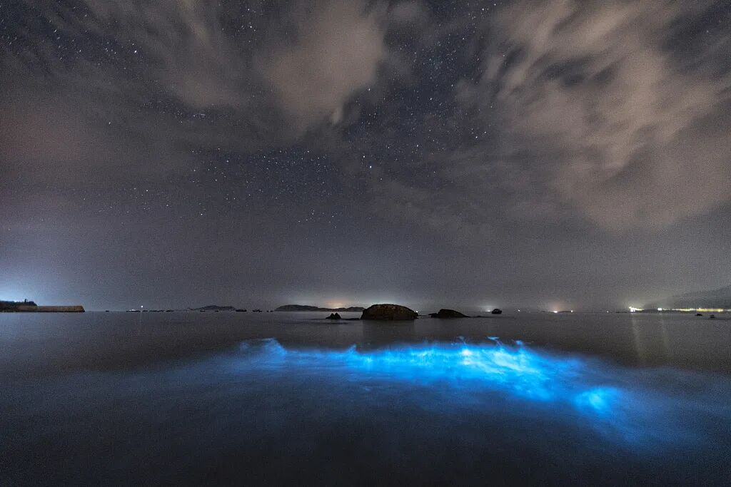 福州平潭县,俗称海坛,东临台湾海峡,由126个岛屿组成。图为平潭海域观察到的荧光海现象,蓝色的荧光可能源自赤潮生物夜光藻。