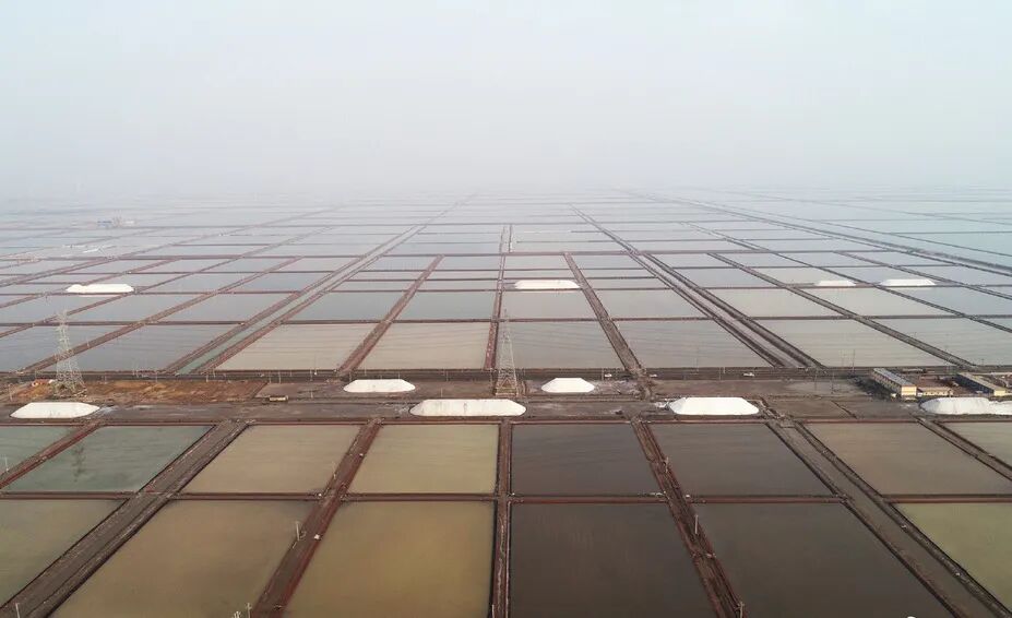 鲁北的滨州,由于受到黄河泥沙的倾泻,遍布着浑浊的泥滩,海水也被染成了黄色。人们在这片莽野湿地上开辟了一块块盐田,每到海盐收获季,就会呈现出斑斓的色彩。