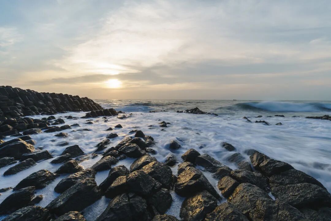 漫长的地质年代里,火山数次的喷发,造就了福建漳州滨海火山遗迹的玄武岩柱状节理,数万根整齐划一的多边石柱构成的岩体镶嵌在海浪中,伴随着潮起潮落。