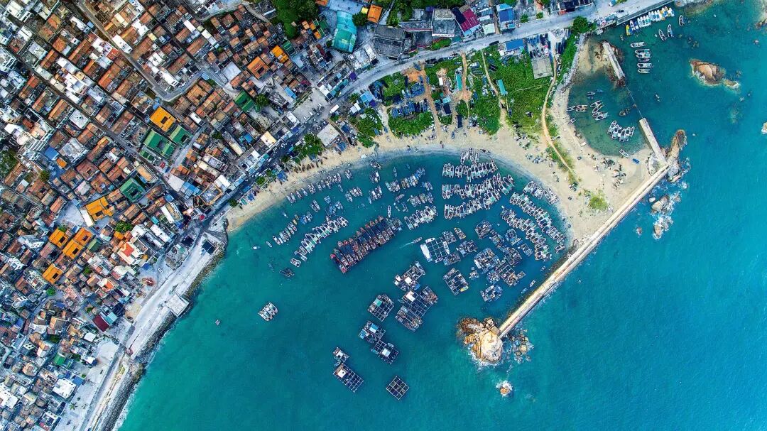 广东汕尾市东部的红海湾,是市民亲近海洋的绝佳观景点。此地沙滩呈现弧状,沿岸礁岩姿态万千,大小渔船井然有序地驻泊于港内,