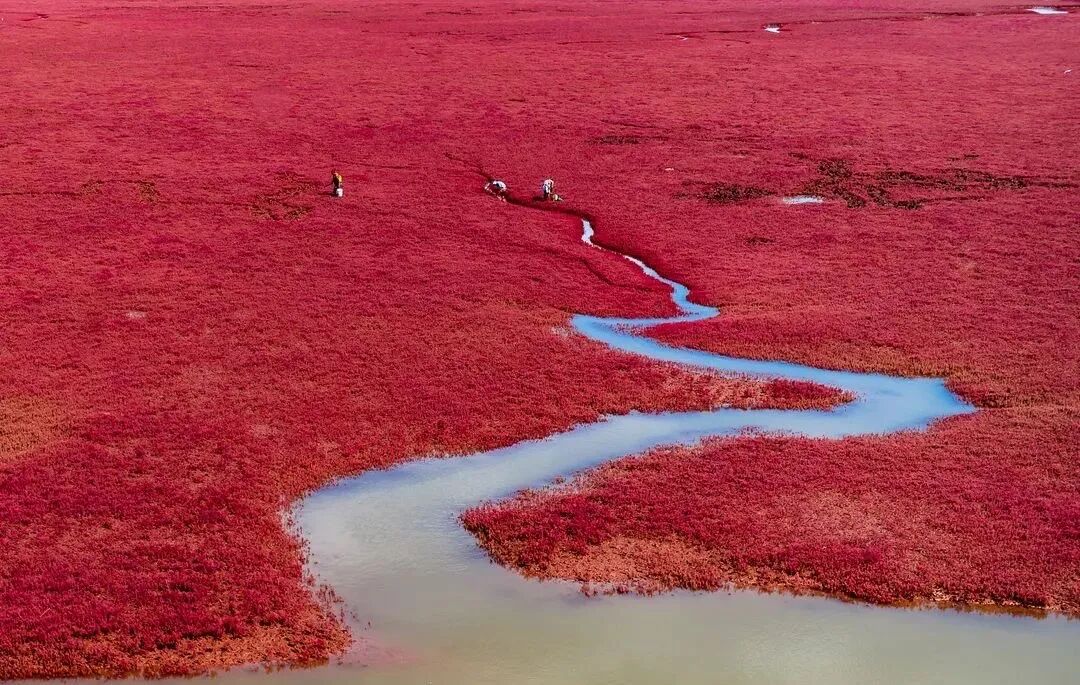 在盘锦市辽河入海口的潮间带上,生长着大量的盐地碱蓬,将海滩染成了一片明丽的的红色,因此又被称为“红海滩”。