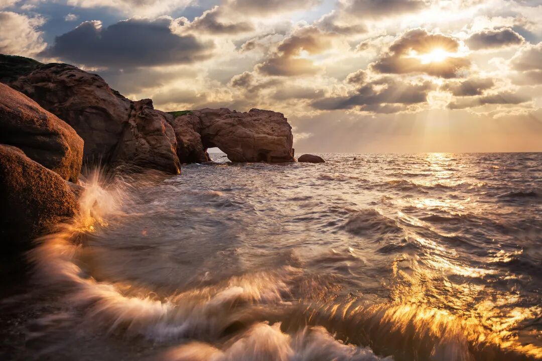 营口位于辽东湾东侧,分布有一块岬湾型的砂质海岸,而这段岸线上的海蚀地貌比沙滩堆积更引人注目。图为营口的团山国家海洋公园,海蚀崖、海蚀穴、海蚀拱桥等层出不穷。