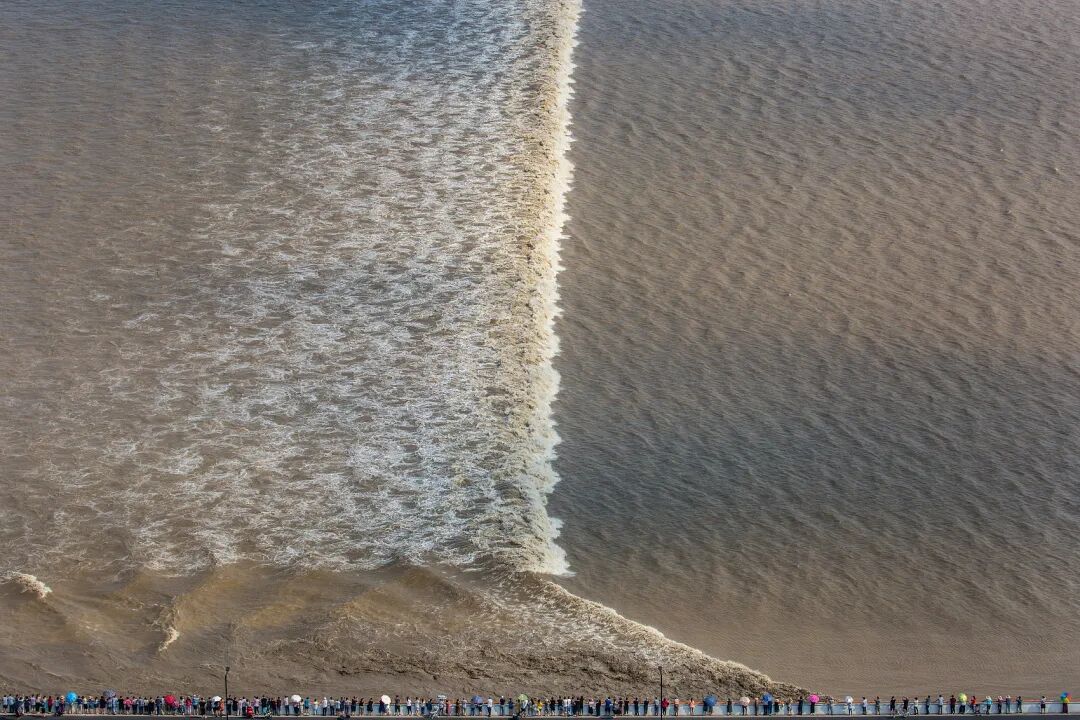 每年的阴历八月十八日前后,外海的潮水每年倒灌进喇叭形的钱塘江口,形成特大涌潮。在杭州和绍兴,市民都能窥见这番大海造就的胜景。图为在杭州下沙拍摄的“一字潮”。