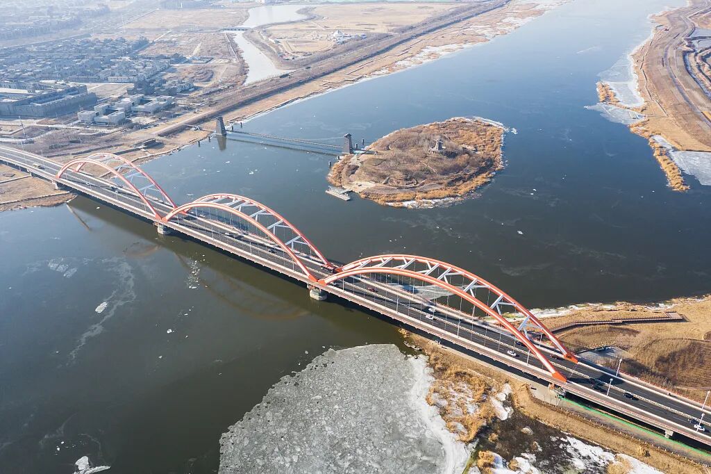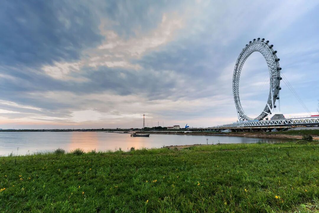 潍坊市位于山东半岛中部,北濒渤海莱州湾。图为“渤海之眼”摩天轮,坐落于白浪河出海口上,是世界上最高的无幅式摩天轮。