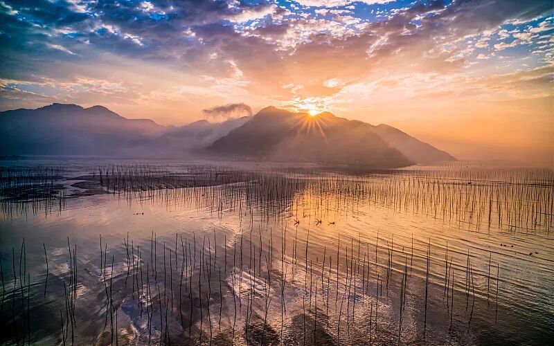宁德霞浦被誉为“中国最美的滩涂”,潮间带特有的生态环境,让这里成为海水养殖的天堂。渔塭、蚵架、竹筏、蛏埕,让鲜美水产的规模产出成为可能,同时造就了一派海上田园的渔业景观。