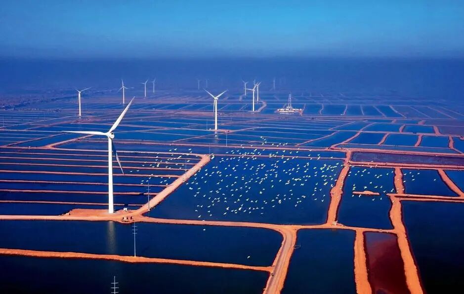 沧州沿海是大面积的盐碱地和滩涂,难以建设成传统的海滨浴场。今天,盐田和风电设施让这片本难以利用的土地焕发生机,图为沧州黄骅港附近。