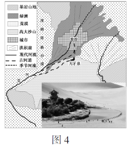 【2013·江苏】图4是甘肃省敦煌市地貌类型图。高大的鸣沙山环抱着月牙形洼地,泉水在洼地汇聚形成月牙泉(见图4右下角照片),素以“千年不干”著名,但近年来日趋干涸,当地政府发出“拯救千年月牙泉”的呼吁。读图回答9~10题。
