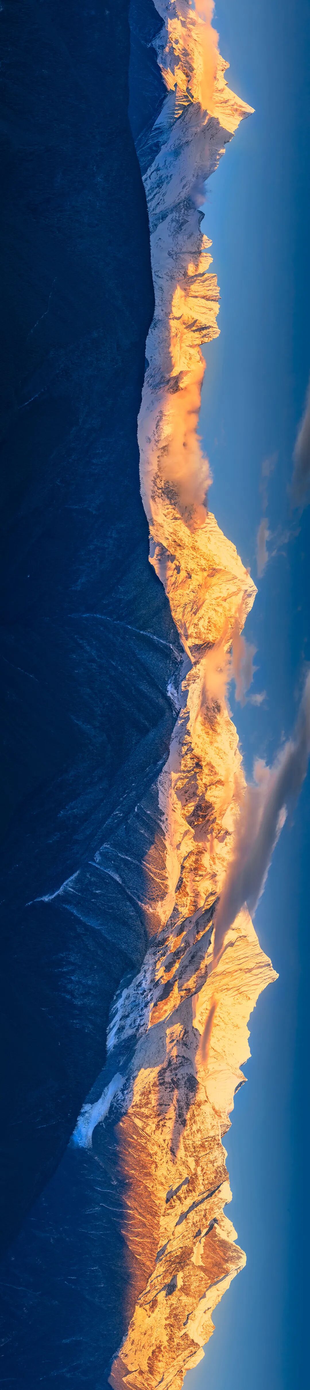 从卡瓦格博峰山尖第一抹金色的阳光开始,十来分钟时间,梅里十三峰被依次披上了华丽的金装,巍峨,神圣。