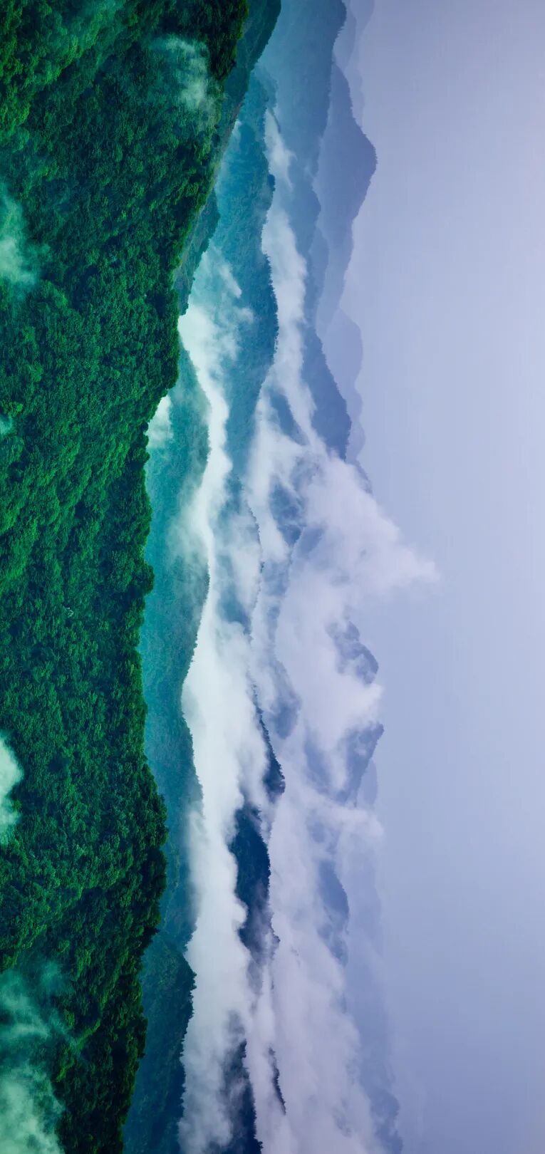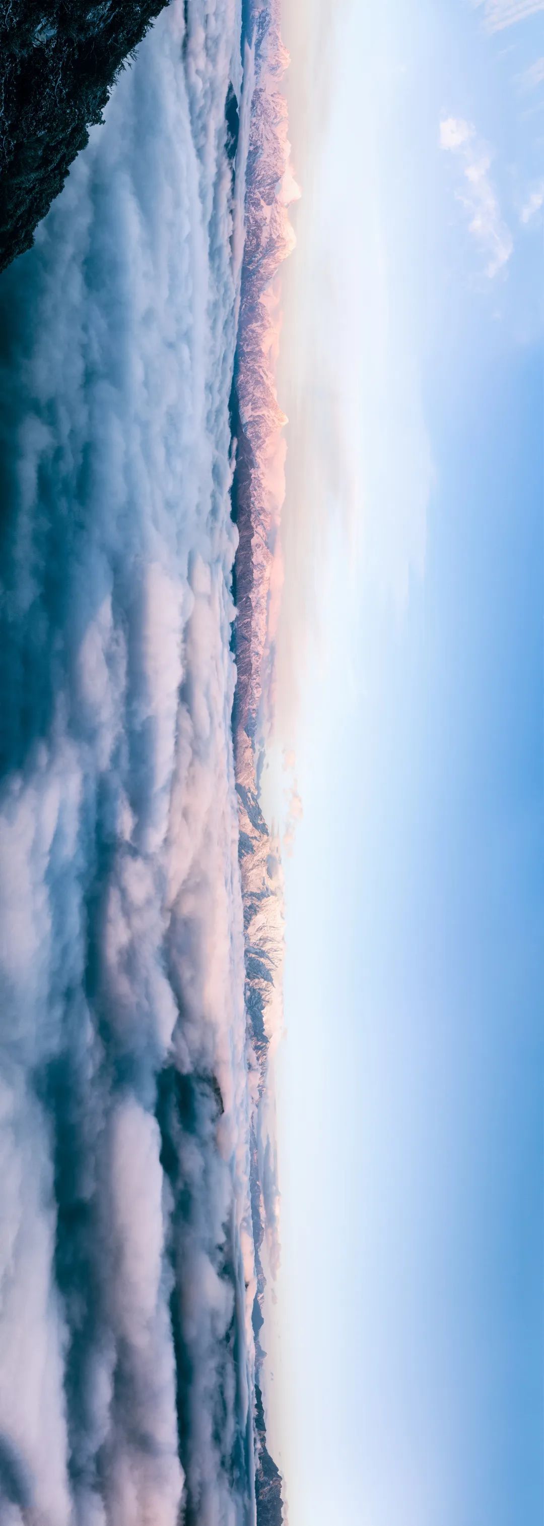 云海逐渐浓密,一铺万顷,山峰湮没在云海之中,行走其中,回头看已是云深不知处。往高处走去,一片片白云像巨大的棉花糖,漂浮在湛蓝的天空中。