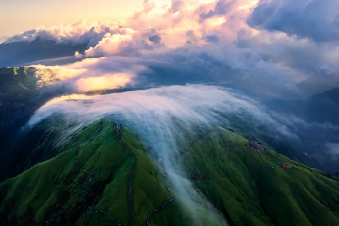 武功山森林覆盖率高88.1%,高于中国、以至世界平均水平,是国家级森林公园和自然保护区,名副其实的“云端氧吧”。若来一场雨,武功山现壮美云海!翻腾的云海,如流水一般,掠过山间,掠过微微湿润的发梢。