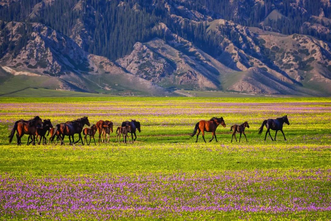 初夏的5月,赛里木湖畔格外震撼人心。远处天山融化的雪水使赛里木湖一带,成了一巨幅美丽的画卷,一直延伸到天边的蓝色湖面。清清的湖水与蓝天、湖水、绿地、黄花的极简搭配,却美得炫目,令人称奇,甘愿沉醉其中,不忍离去。湖水湛蓝,青青的草原上溪水潺潺,紫、红、蓝、白等五颜六色的无名花朵将草毯子点缀得绚烂无比,足以把你的整个视野点亮。