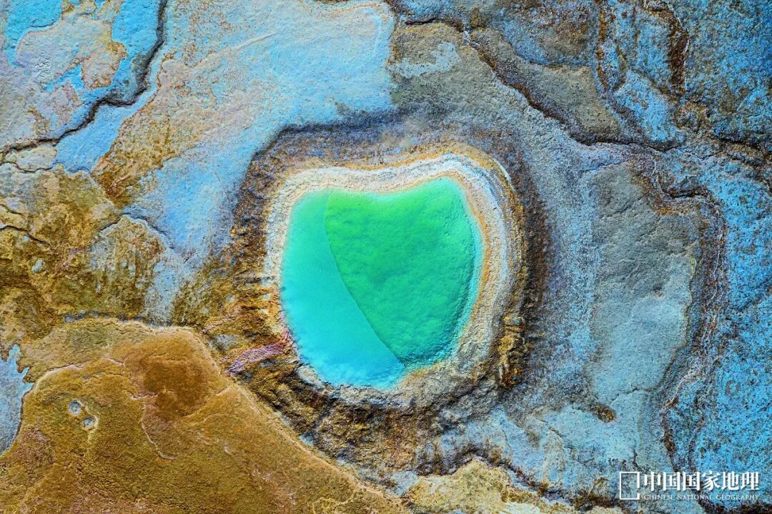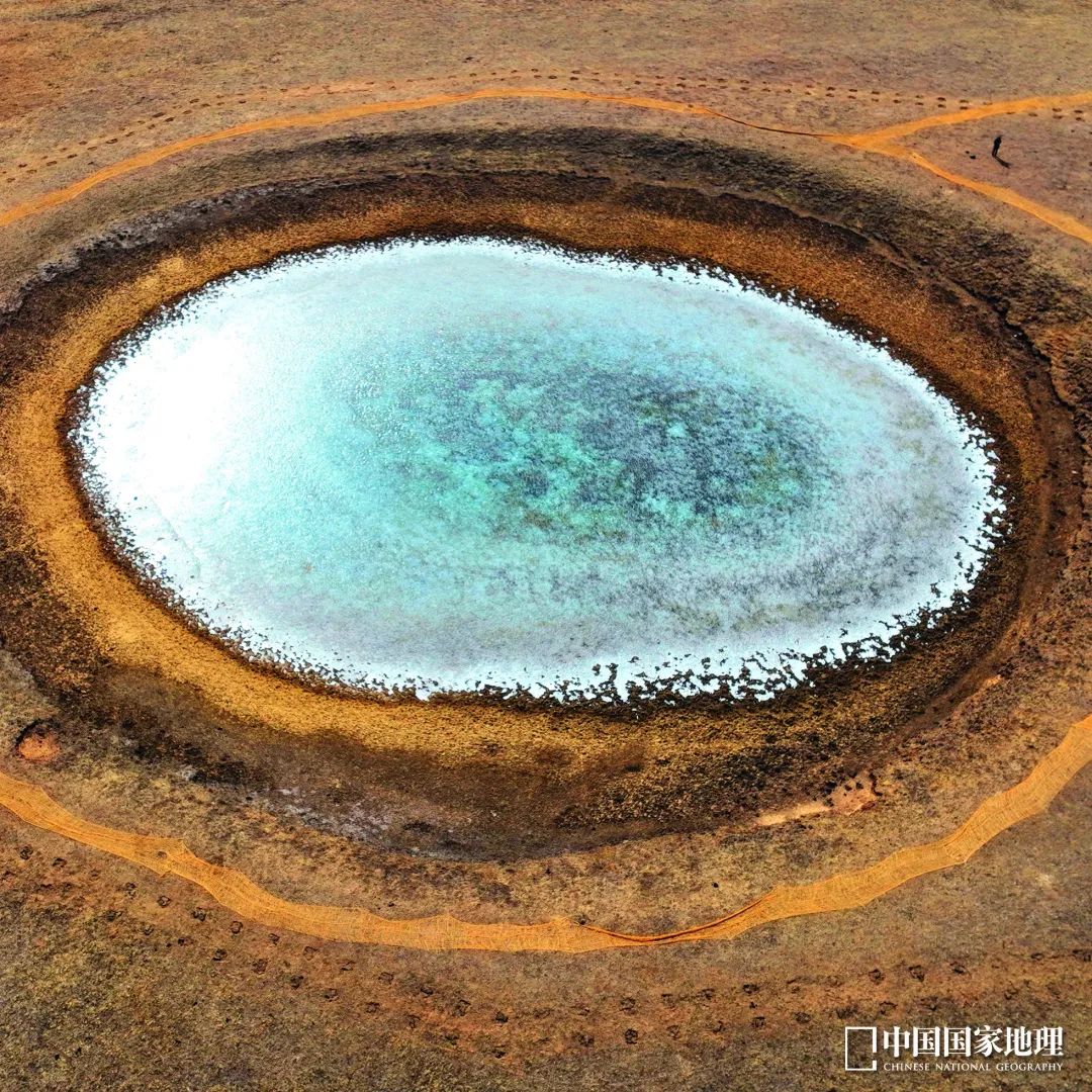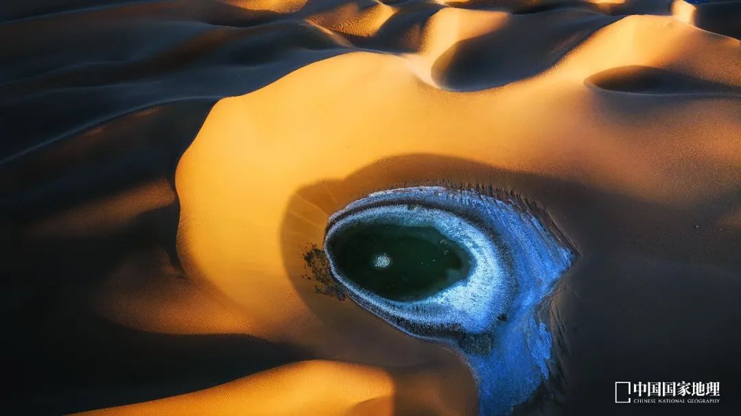 这张图是摄影师在尉犁县罗布人村寨附近的塔克拉玛干沙漠,用无人机偶然拍到的一处泉眼。泉水水位的变化,形成了一圈圈的印痕,很像是为这只“眼睛”涂抹的一层层粉底装饰。