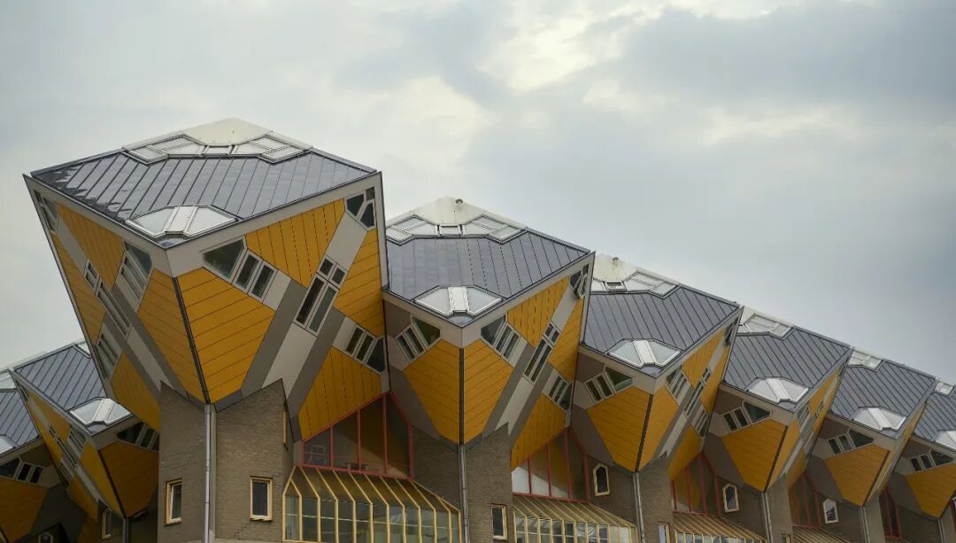 立体方块屋由38座相同的明黄色方块房子组成,位于人行天桥上方,站在屋子里,可以俯瞰商业街和河道。远观立体方块屋,只见一个个巨大的立方体连接在一起,每个立方体呈45度角倾斜,仅靠一个角站立在一个六角形的柱子上。走近观察,你会发现每个立方体都是一座单独的房屋,三个面朝向地面,另外三个面朝向天空。