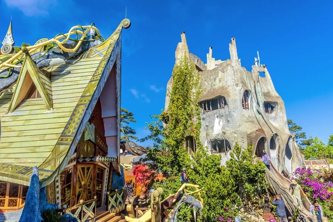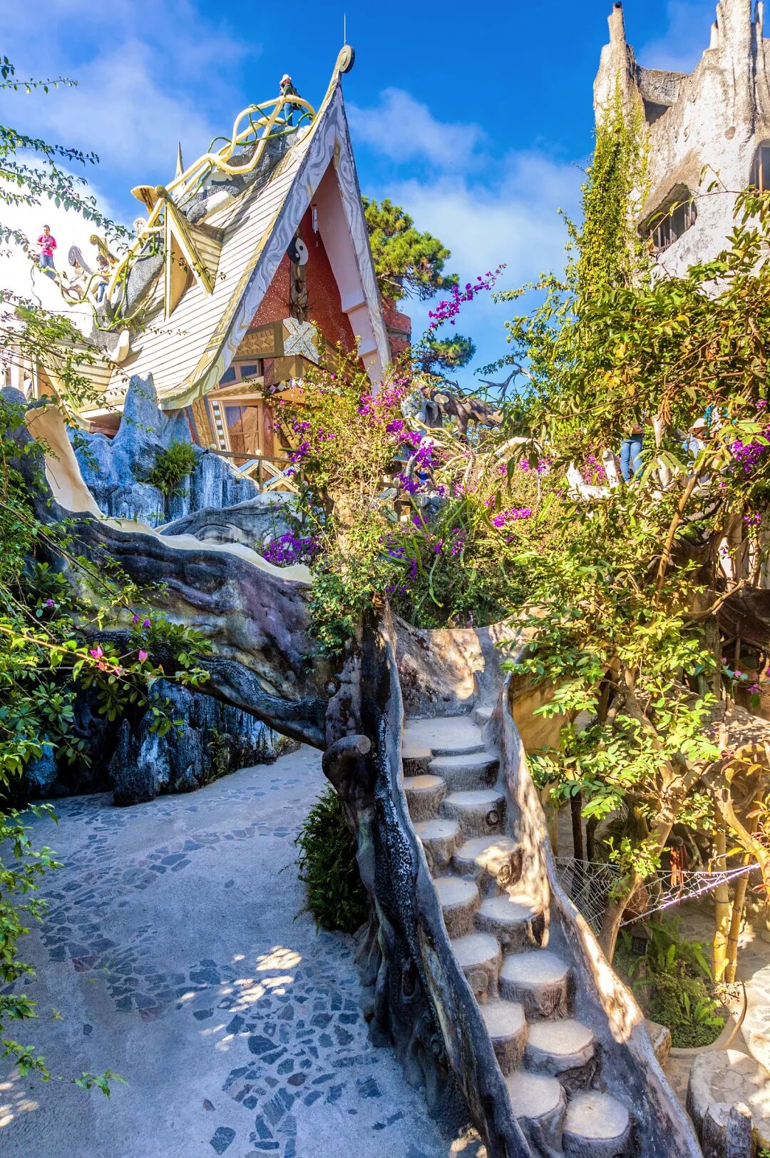 疯屋子原本是一家酒店,夸张怪异的造型使它成为大叻有名的景点。疯屋子的设计者是越南前总统的女儿,她在这一建筑中,展示了艺术的自由。疯屋子的外形酷似一棵巨树,其中还融入了蜘蛛网、洞穴等元素,参观者需要通过巨大的树洞、踩着木桩阶梯走进屋内。