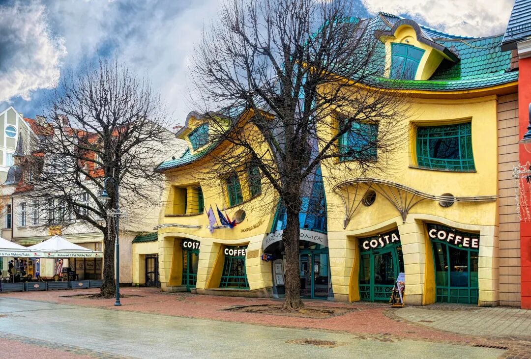 歪屋也叫扭曲的房子,建于2004年,面积约4000平方米,是一家购物中心的附属建筑。屋子的正面是一张人脸,楼身呈扭曲的褶皱形,仿佛一栋酒后醉态可掬的卡通房子。房子用色夸张鲜明,夺目的蔚蓝、跳跃的鲜绿、暖暖的浅黄……五颜六色的玻璃、砾石以及各种装饰都给人留下深刻的印象。