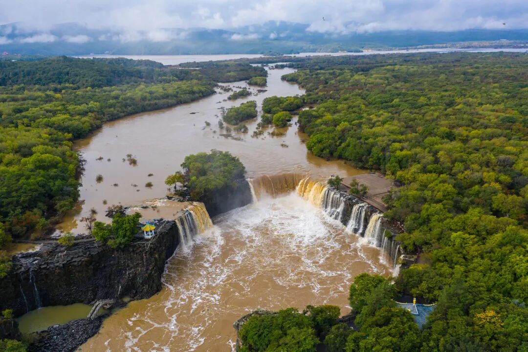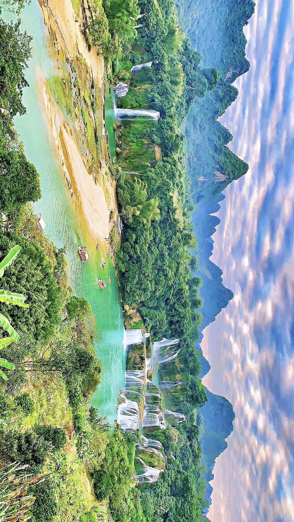 德天瀑布位于中国广西大新县硕龙镇和越南高平省重庆县玉溪镇交界的边境线上,从德天村至硕龙镇一段以归春河为天然国界。瀑布气势磅礴、蔚为壮观,河水时急时缓,时分时合。落差70余米,最大宽度200余米,年均流量50立方米/秒,是黄果树瀑布的5倍。