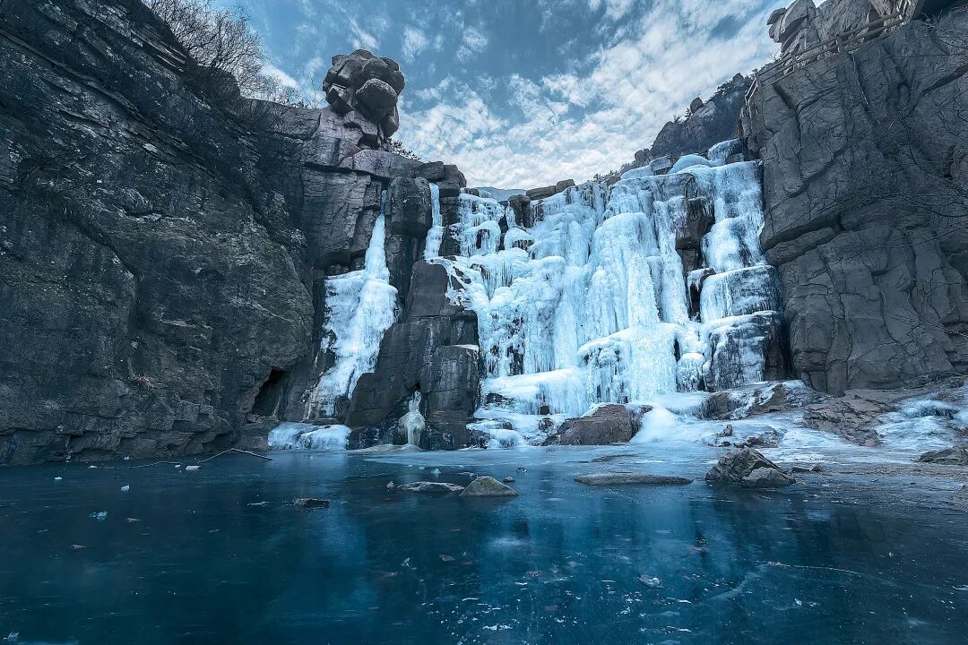 冰川型瀑布多出现在四季冰雪不断的地方,冰块相互碰撞汇集,从高耸陡崖崩落而下形成壮观的冰瀑布。