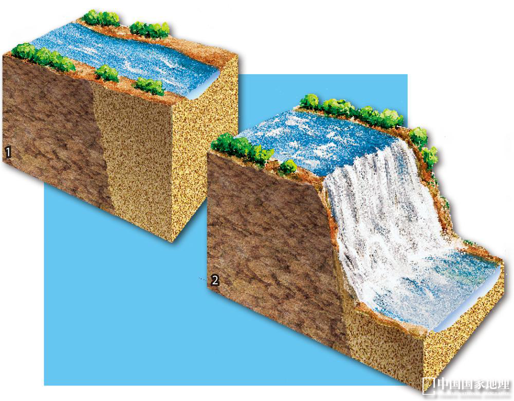 河床存在不同类型的软硬岩石,当受到流水的持续侵蚀,会表现出差异化。偏软的岩层更容易受到破坏,形成陡崖,例如重庆北磅磨滩高坑崖瀑布。