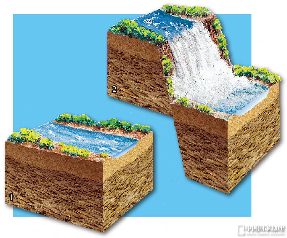 地下岩层活动发生断裂,上下错动后形成陡崖导致流水突然向下跌落而形成断崖瀑布。若发生多次断层,可形成多级瀑布。