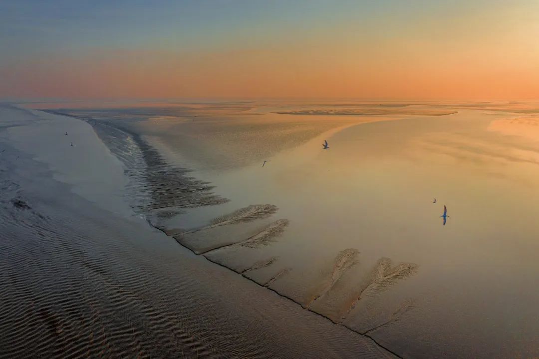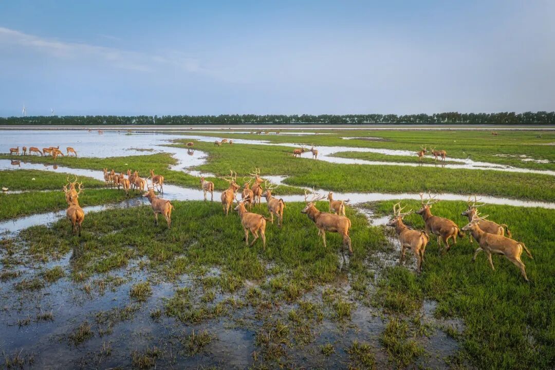 在盐城的淤泥质海岸上,潮汐冲刷出的潮沟像是一颗颗“潮汐树”,吸引着无数的海鸟在此栖息,成为了数十万候鸟及许多野生麋鹿的“第一湾区”。