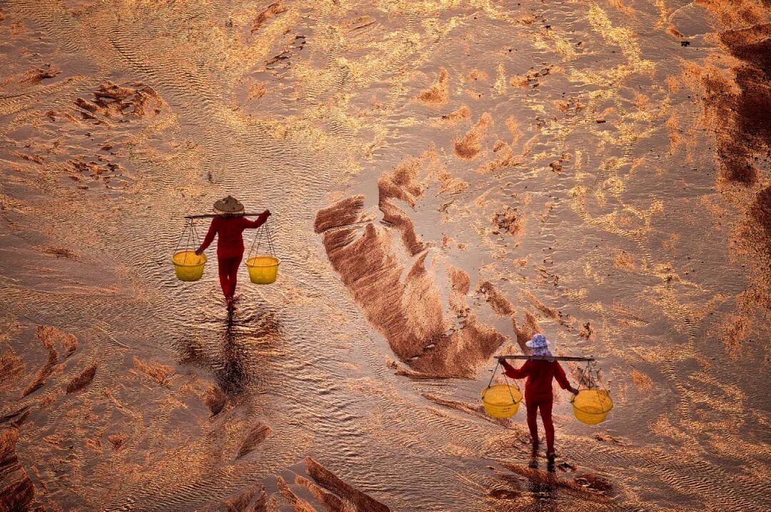 霞浦,人们挑着水桶穿过一片金色滩涂,随着霞光悠悠晃行,这里享有“中国最美滩涂”的声誉。