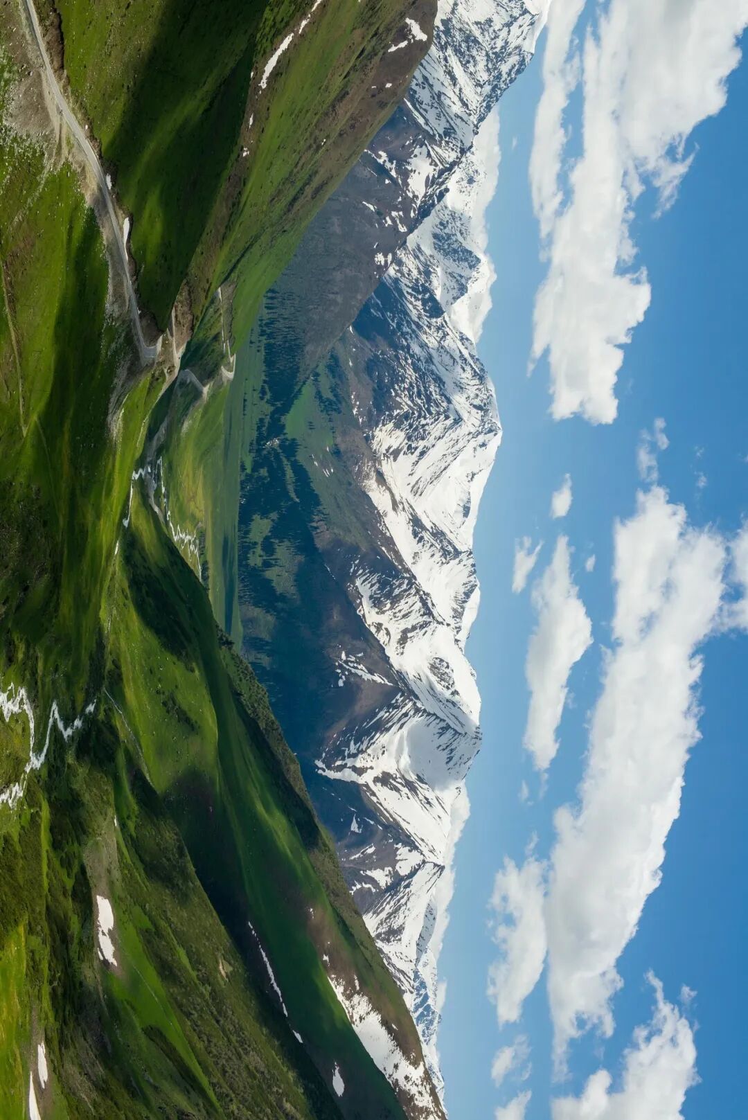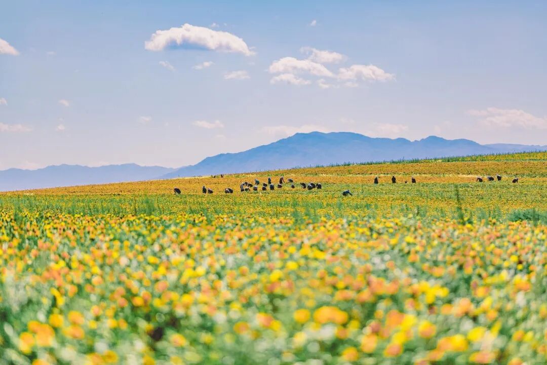 夏之疆,雪山脚下牧草肆意生长,小野花开满山腰变成海洋,夏季的明媚从景色折射进眼里。