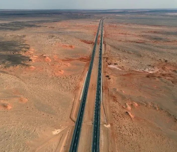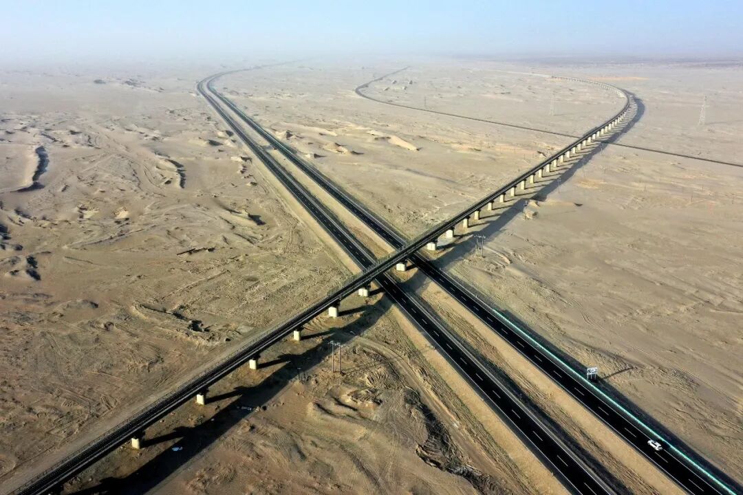 图为若民高速与和若铁路在大漠里纵横交错