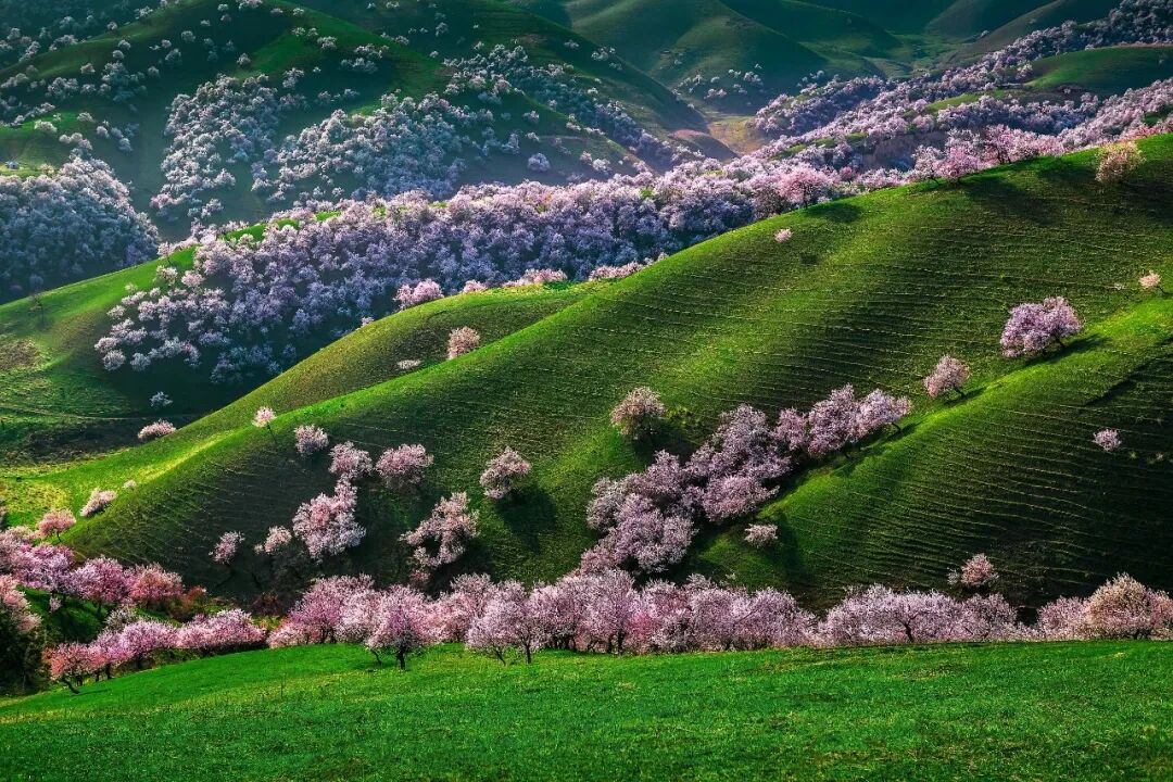春之疆,在起伏的山背上,杏花遍开枝桠,睁眼闭眼都是春色。