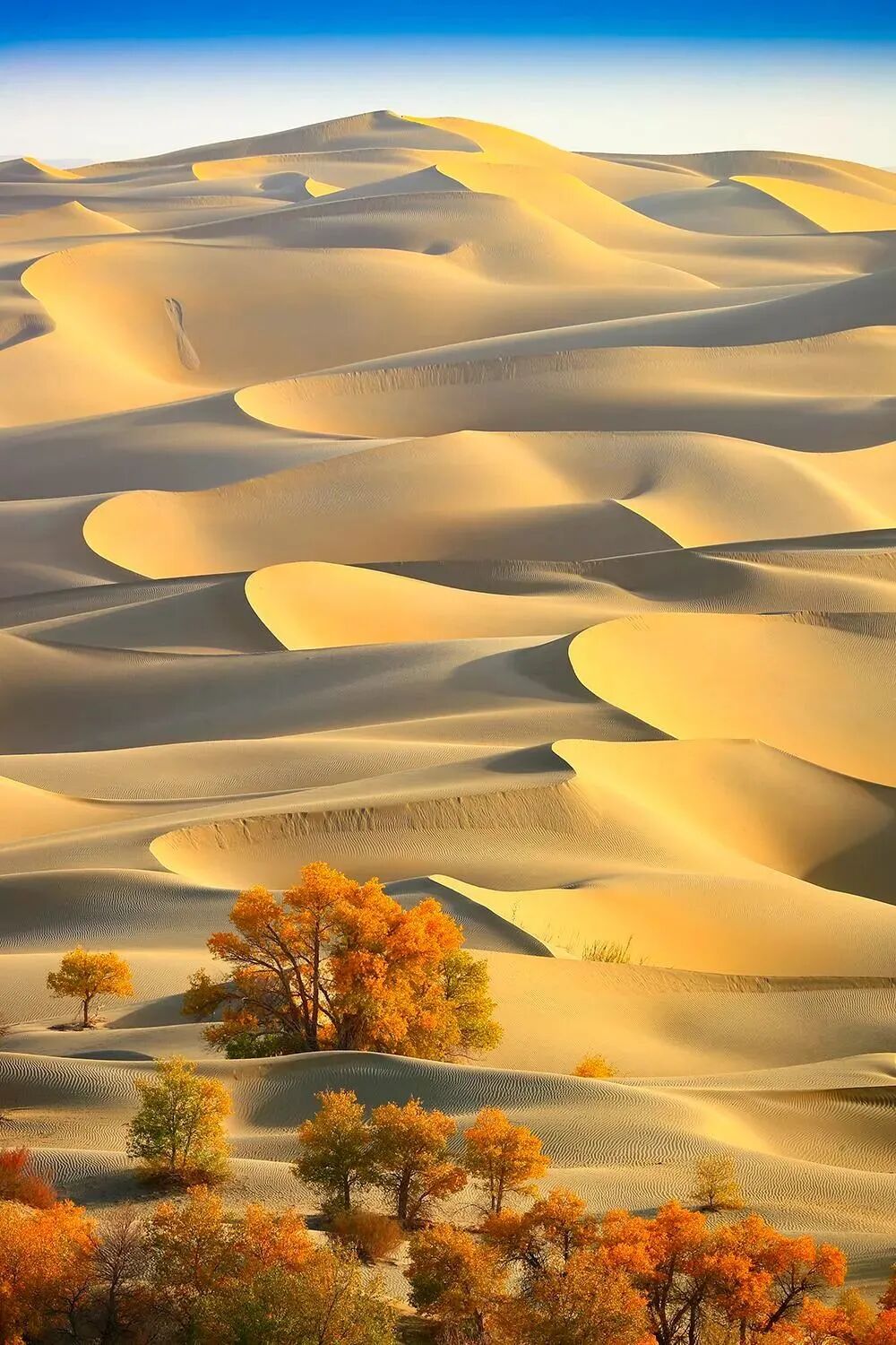 在这个中国最大的沙漠里有着最多的沙丘景观,新月形沙丘链、线形沙丘、金字塔形沙丘、鱼鳞状沙丘群等,可以说塔克拉玛干就是风沙地貌的博物馆。