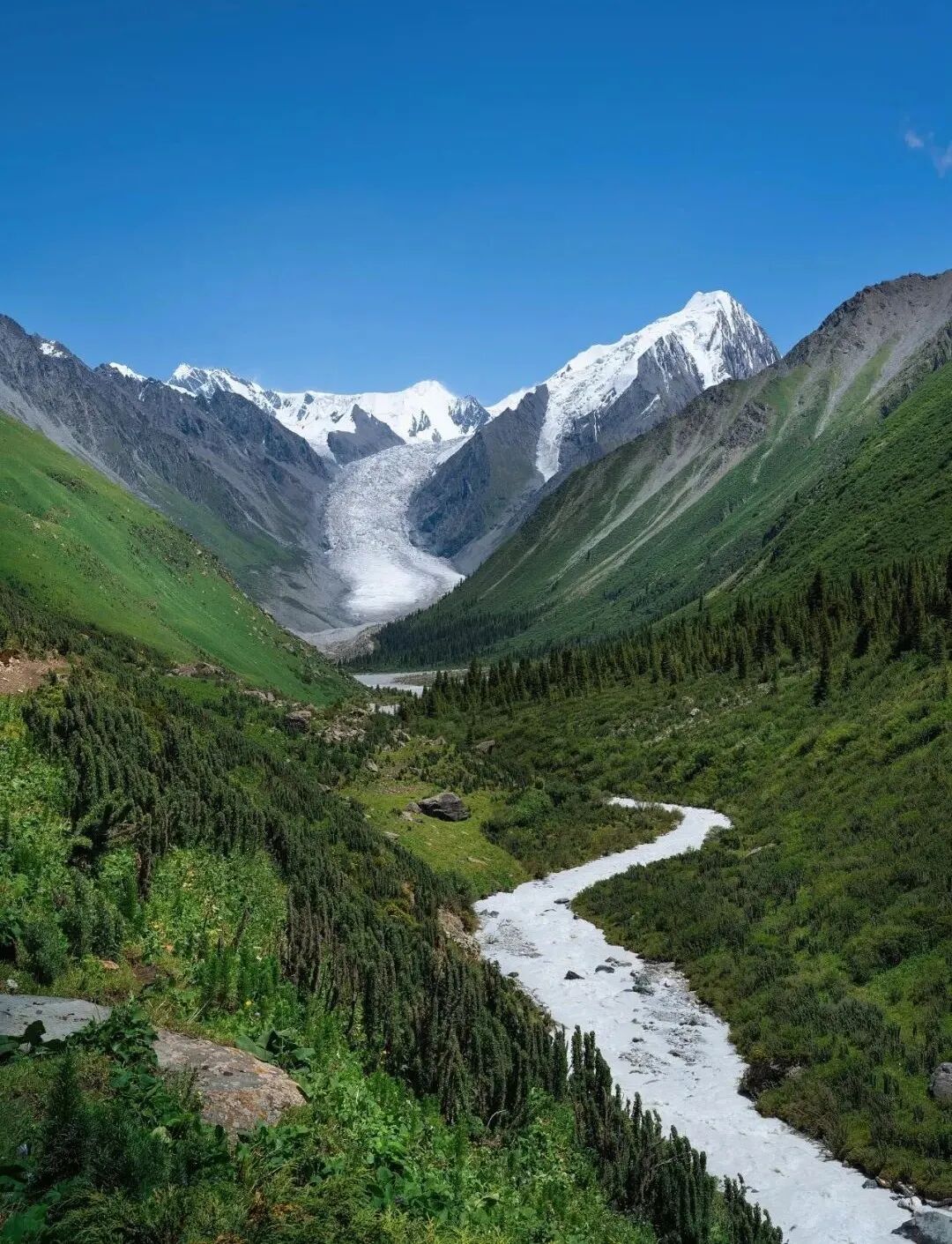 在天山,你可以看到雪山逶迤,冰川纵横,河流蜿蜒,湖泊星布,草原如茵,草甸烂漫,森林如带,荒漠苍茫……这里不仅有和谐与完美,更有矛盾和冲突:天山把寒冷与炎热,干旱与湿润,平坦与陡峻,高大与深邃,冰雪与绿色,丰富与单调等对立面并置在同一时间和空间中。