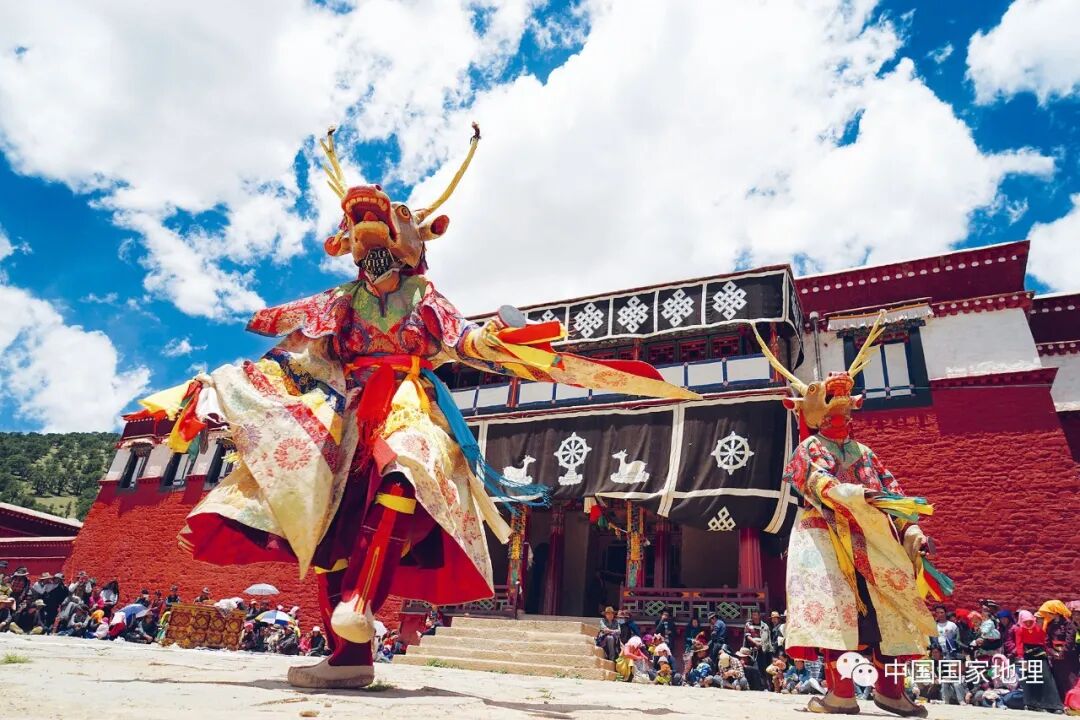 热振羌姆兴起于林周县热振寺,随着藏传佛教在历史上的弘扬和发展,这种宗教舞蹈艺术的形式和内容也越来越丰富。其独特的服饰、昂扬的舞步、悠长的唱腔,受到各地藏传佛教信众的欢迎。摄影 / 卓·丹增曲培