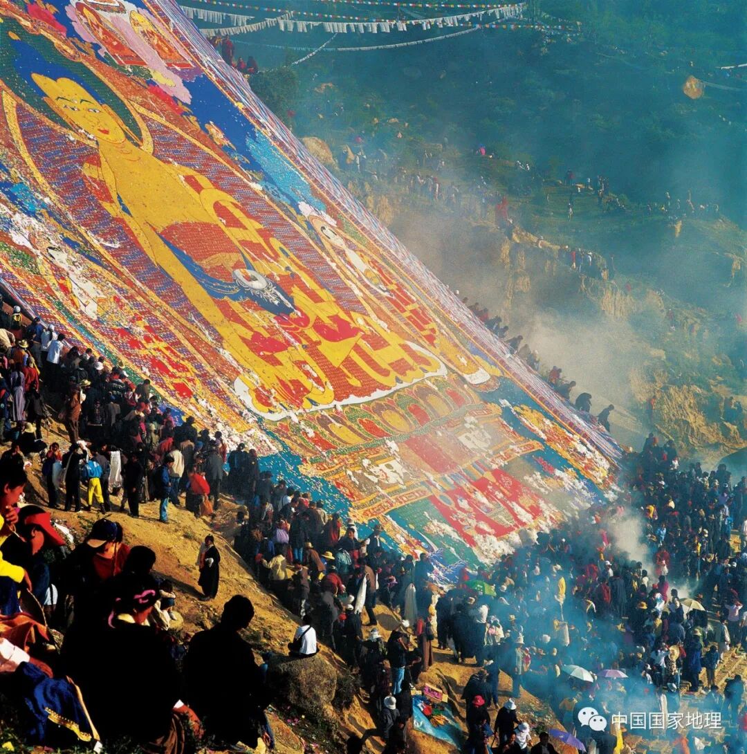 在“展佛日”里,长达数十丈的缎质佛像,被展挂在展佛台上,而站在高处远望,展佛台前万头攒动,薄雾萦绕,一时间会让人觉得,眼前五彩斑斓的佛像,仿佛照亮了山谷。