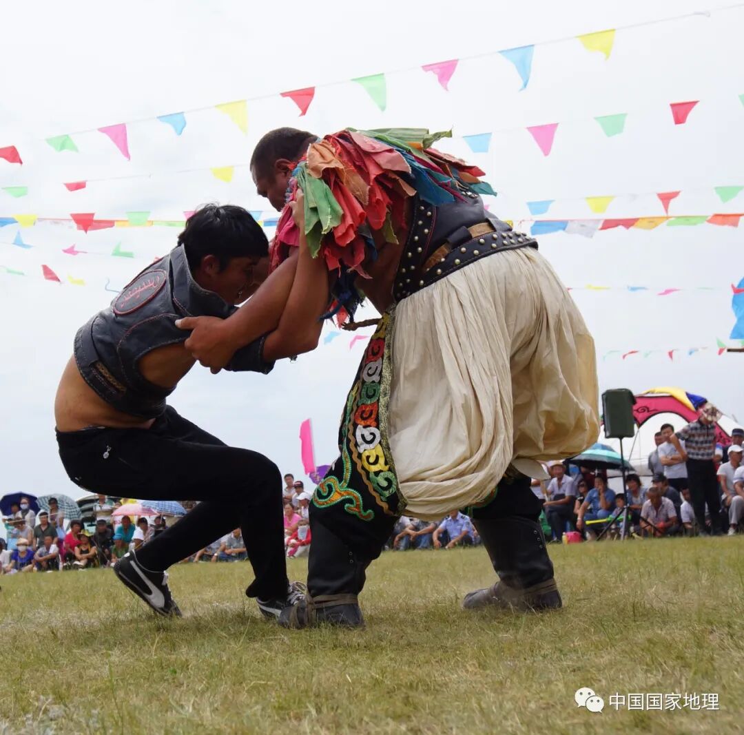 摔跤是蒙古族传统的体育娱乐活动,早在13世纪就已盛行在草原上。一年一度的“那达慕”(蒙古语意为“游艺”)竞赛项目有赛马、摔跤、射箭等,各项竞赛的优胜者都是享有盛誉的草原英雄,这体现出蒙古族人世代相传的崇尚勇猛的性格。摄影 / 额博