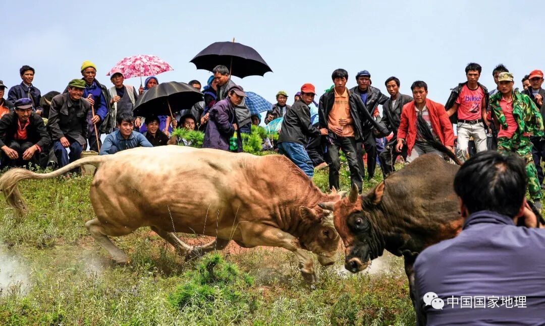 云南寻甸彝族立秋节最重要的活动是斗牛,来自不同村寨的黄牛被拉上秋场,轮番决斗,其中有躲闪的一方将被判为输家。上图中,两头黄牛势均力敌,正剑拔弩张地激烈缠斗着。摄影 / 马克军