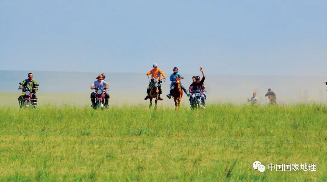 蒙古那达慕大会上,两位小骑手把其他对手遥遥甩在身后,正在向着终点做最后的冲刺,二人二马争得不相上下,身后是骑着摩托为他们呐喊助威的父辈亲戚。蒙古族赛马的小骑手通常是体重30—35公斤、勇敢、机灵的孩子,他们不但要掌握驾驭赛马的技术,还要有充分的体能。摄影/舒泥