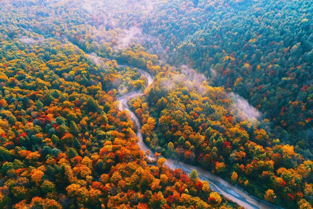 万顷林海被秋日阳光浸染成了五彩缤纷的颜色。白桦的金色、花楸的橙红、蒙古栎的深黄,其中最引人注目的莫过于大片大片热情的赤红——这些火焰般的颜色属于槭属植物。五彩的红、黄、绿、褐色,层林尽染,犹如一块调色板,这样的风景令人沉醉。