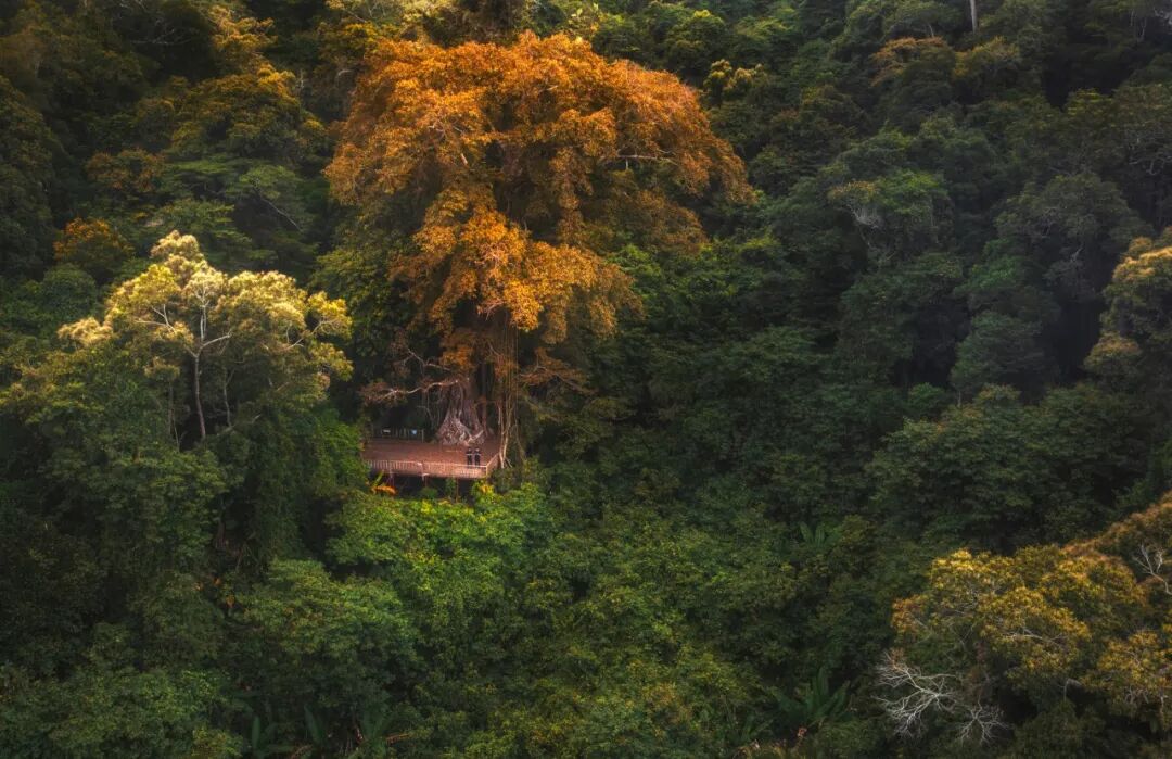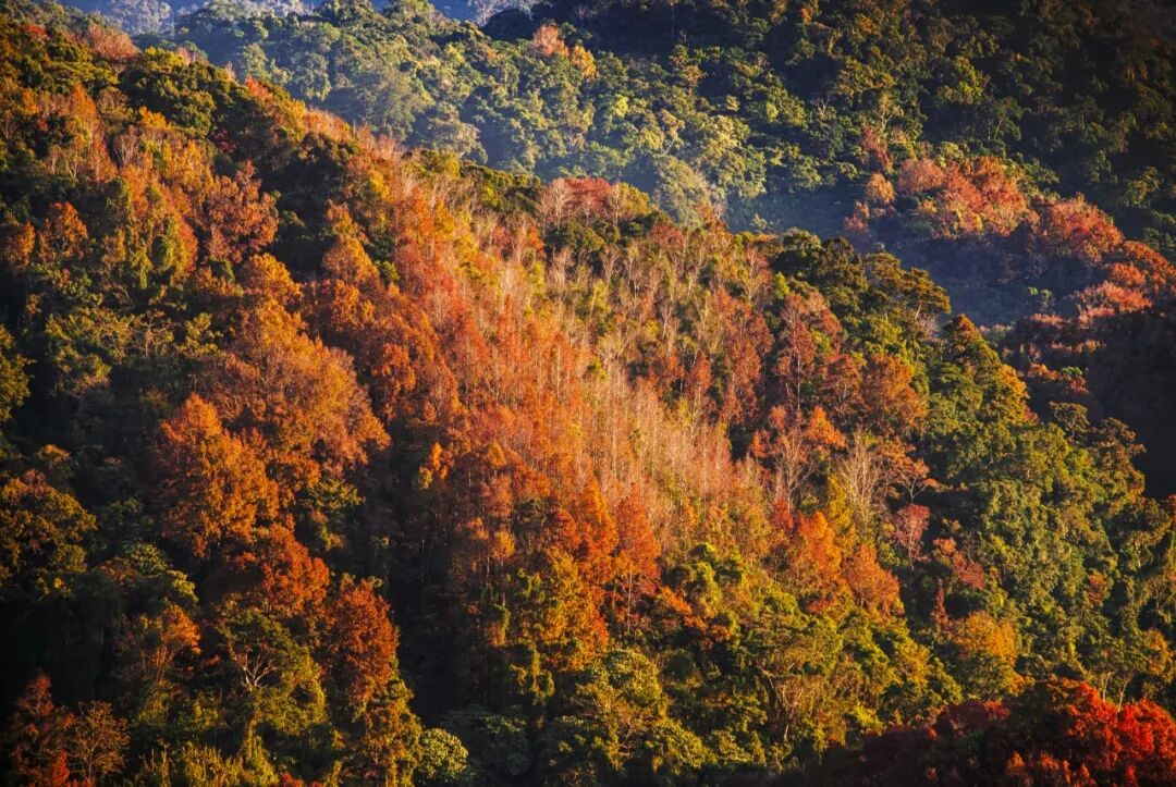 海南有秋这个说法,可能很多人都不知道。作为标志型的热带雨林植物,即使到了冬季,我们也只能看见成片的绿色。好在海南也拥有海拔较高的五指山、尖峰岭、霸王岭三处高山,能见到些许别样颜色的树种,如红色的乌桕、枫香、槭树,黄色的麻栎,绿色的桉树,海南的秋景便浓缩在这里。