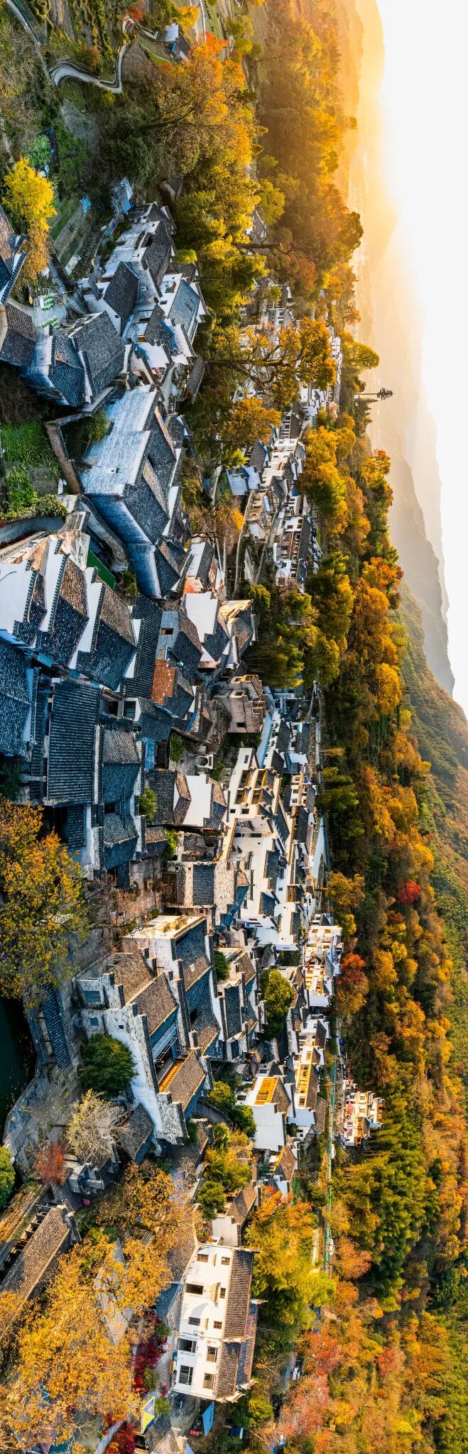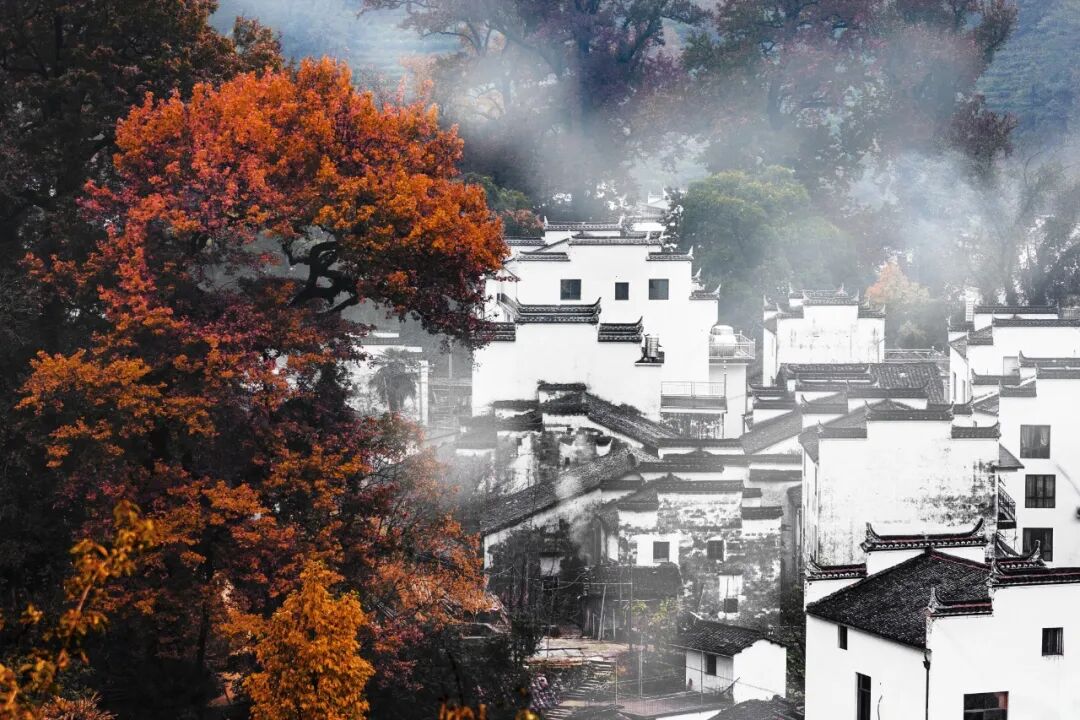 当从岭头远眺,秋色层次分明、色彩绚烂,树树红云黄叶,原生态的徽州秋色让人赞叹不已。村口及周围地带多植乌桕树,且古树参天,每到秋季,满山树叶色彩斑斓,美不胜收。