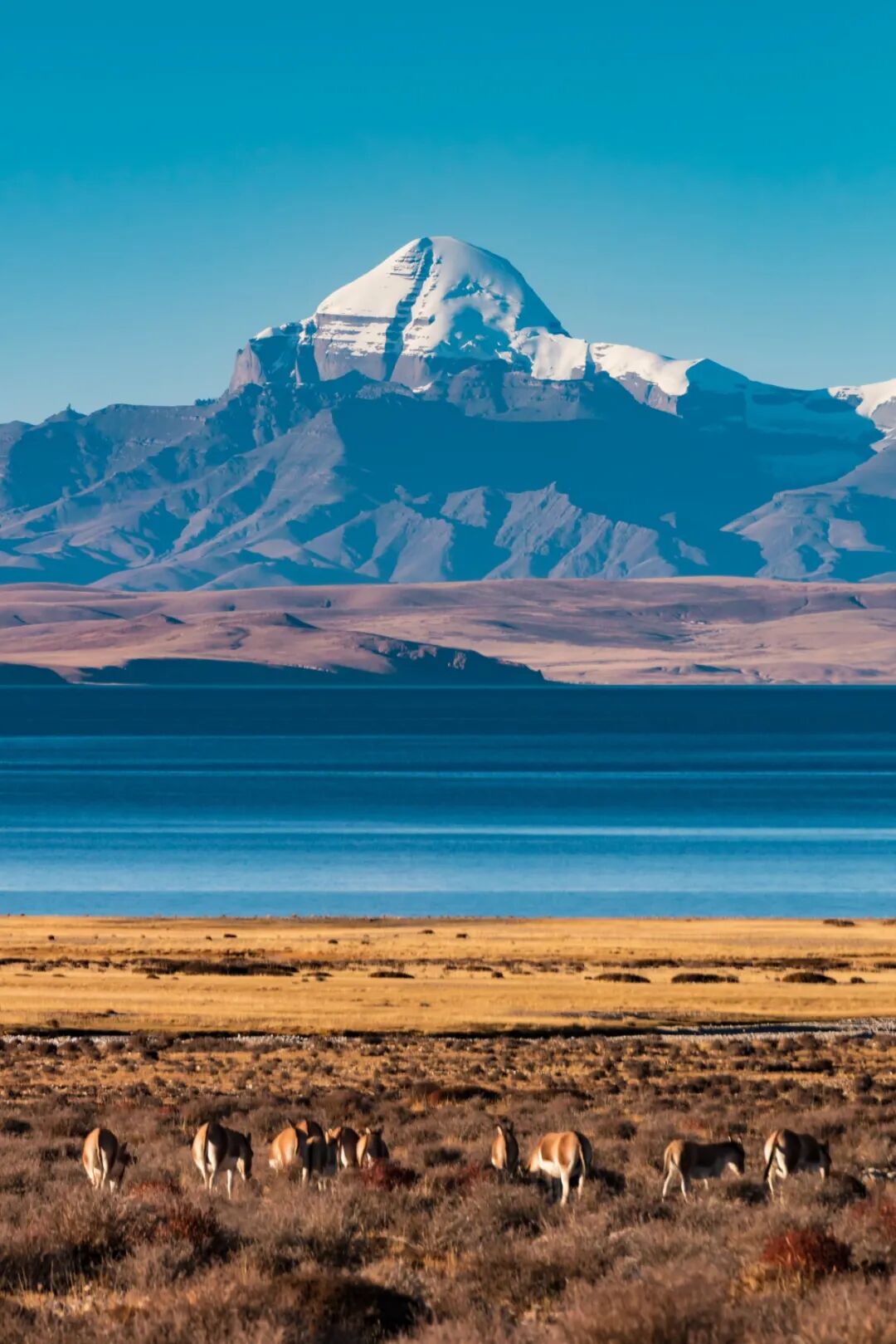 阿里地区拥有草原面积约4亿亩,属高寒草原、高寒草甸和高寒荒漠类型,夏季短暂,冬天冗长,大多数时候,草原都呈现一片金黄色。远处高耸的冈仁波齐,终年积雪的峰顶在阳光下闪耀着光芒,在旁边大片金黄草地映称下,愈发耀眼。