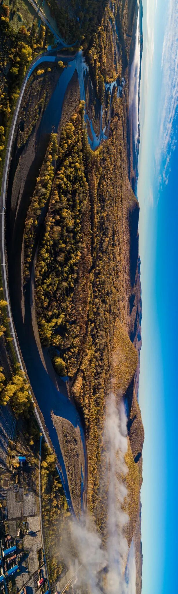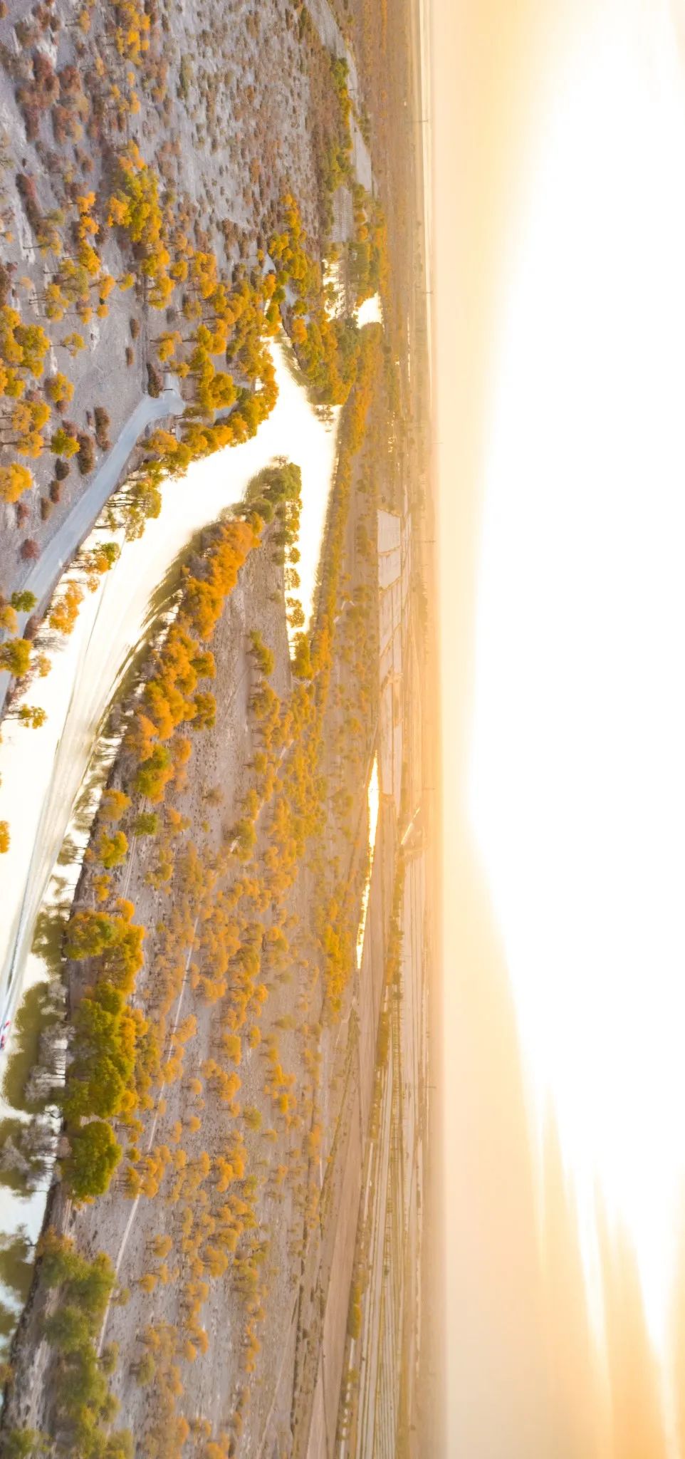 秋季到来,荒野沙漠之上的胡杨林,换上了一年中最灿烂的金色盛装。塔里木河泥沙俱下,曲折蜿蜒,两岸的胡杨沿河道走势一直奔向茫茫天际,落日、胡杨、大漠、河流,如诗如画。