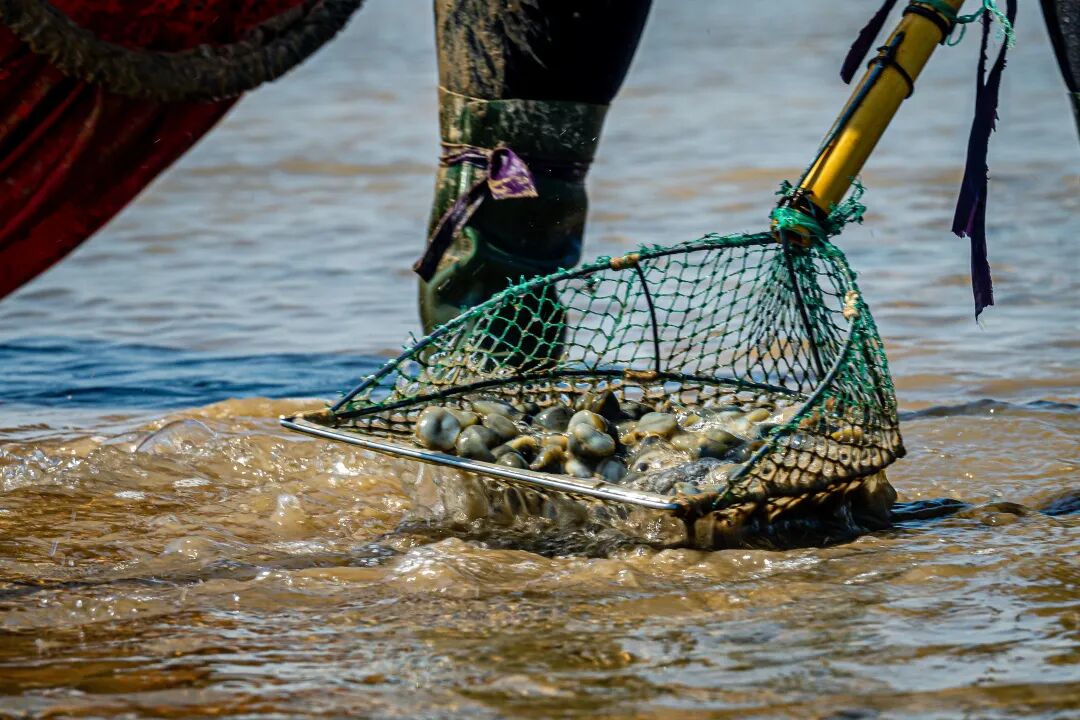 每到落潮后,海滩上到处都是挖蛤蜊的人群,他们手拿工具,在泥沙里翻找。有人直接用铁勺子,或是三角形的小铁铲,还有更“高级”的捕蛤蜊工具耙网,或者称之为“蛤蜊耙”。耙网搅动泥沙,蛤蜊连同泥沙就一起进入网兜,经过淘洗之后,泥沙滤除,蛤蜊就会留下。