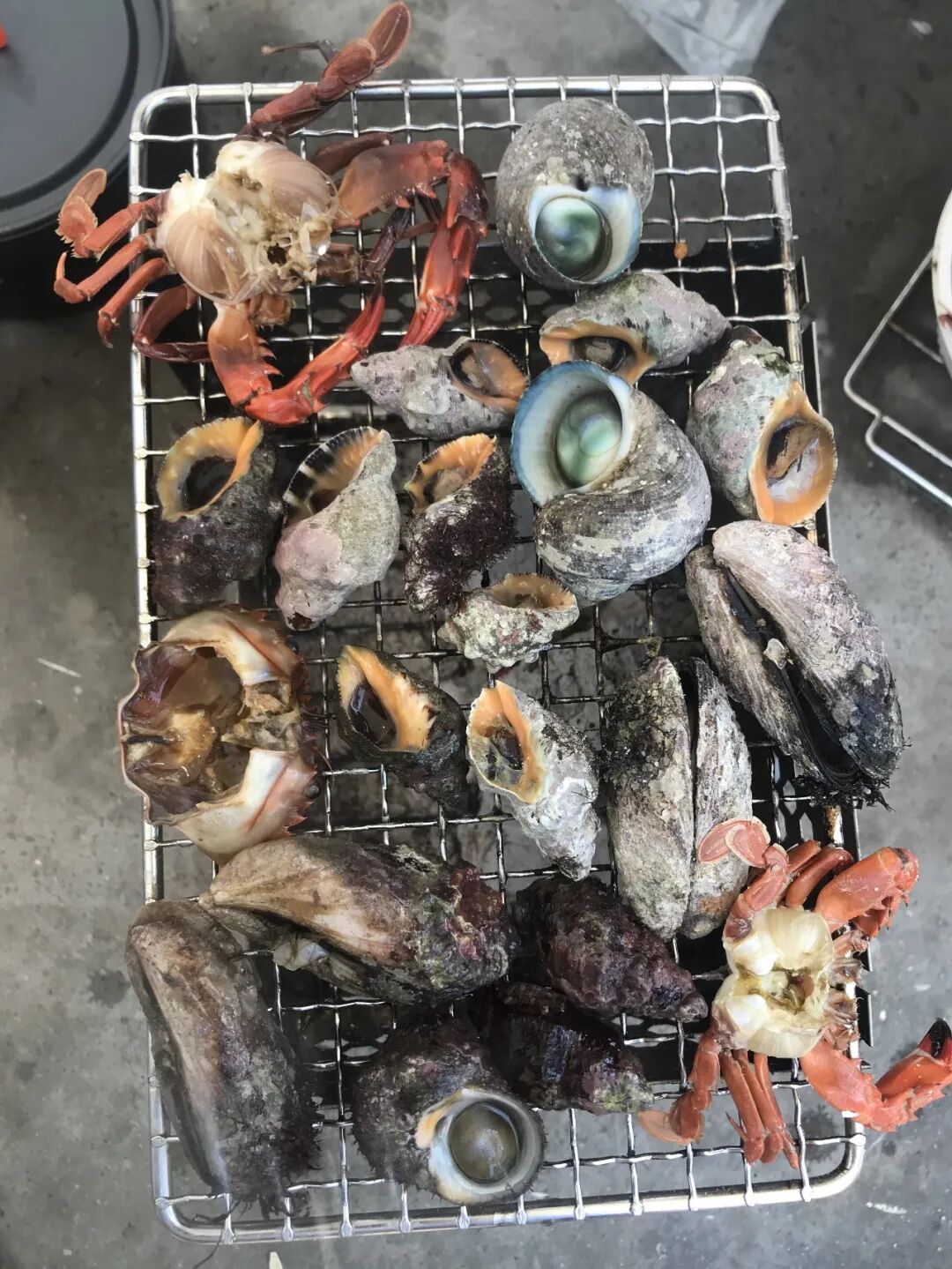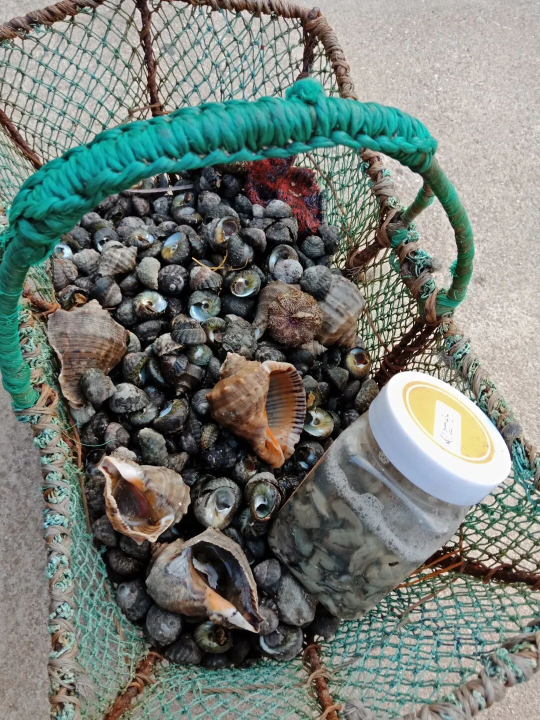 海边的螺类众多,礁石赶海最常见的各式海螺中,猪仔螺、辣螺、猫眼螺、塔螺比较多,它们通常躲在石头缝隙里,颜色和石头非常接近,所以得仔细观察。