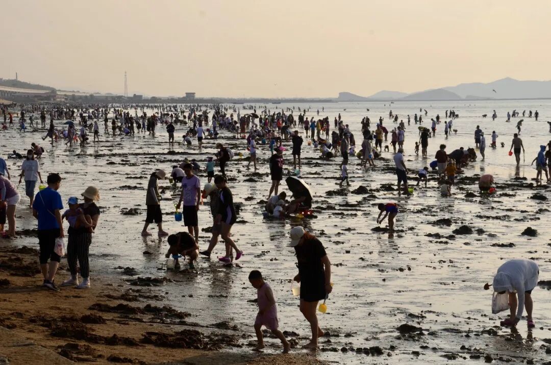 大连西海岸夏家河子海滨公园,退潮后的人潮