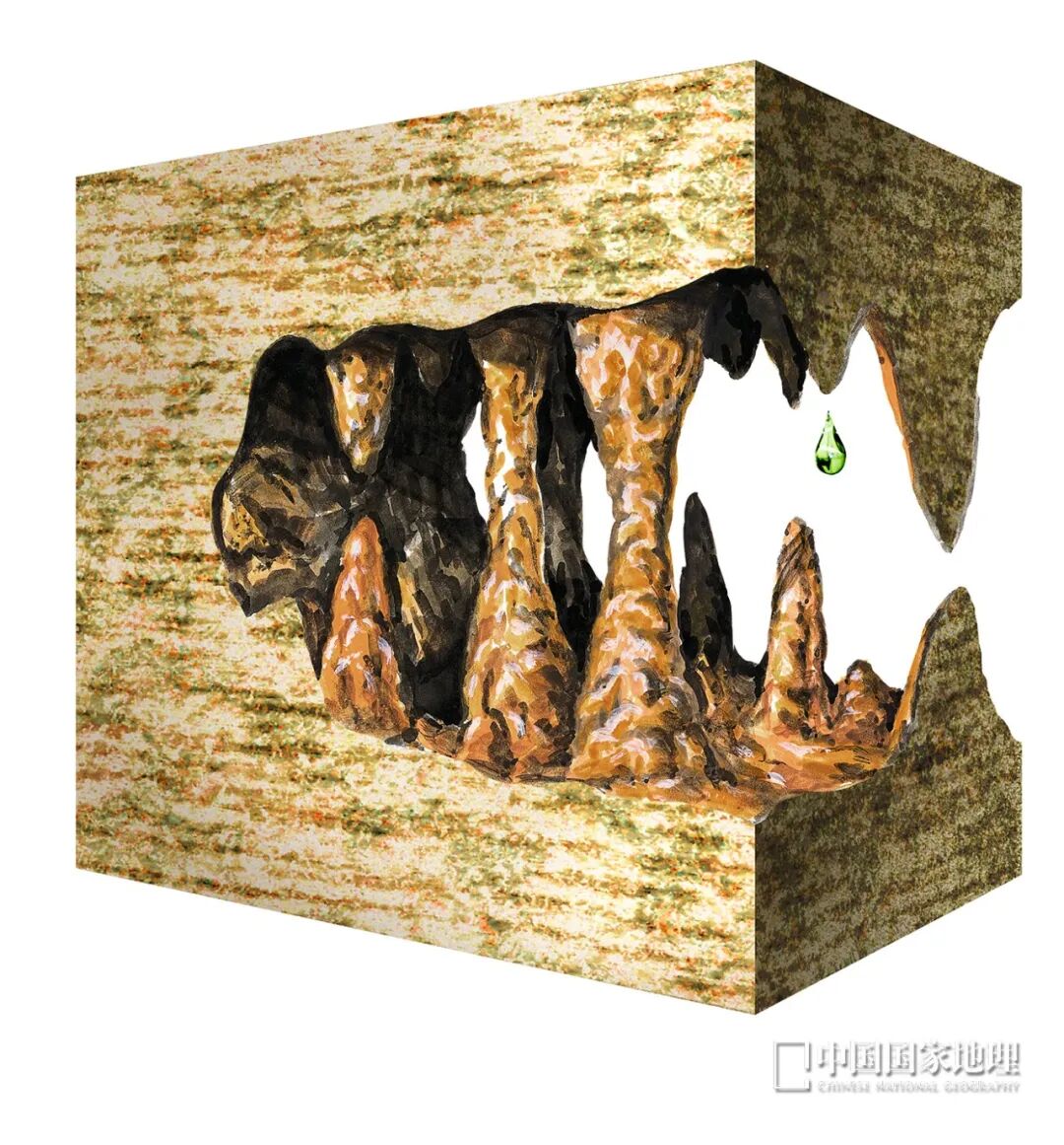 在溶洞的“天花板”上,有很多微小的裂隙,里面的水承受着很大压力,它们会以缓慢的速度向下滴落。而水一旦滴出来,进入溶洞这么宽广的空间时,压力一下子降低,水中的二氧化碳逸出,碳酸氢钙变成了碳酸钙,沉淀下来。